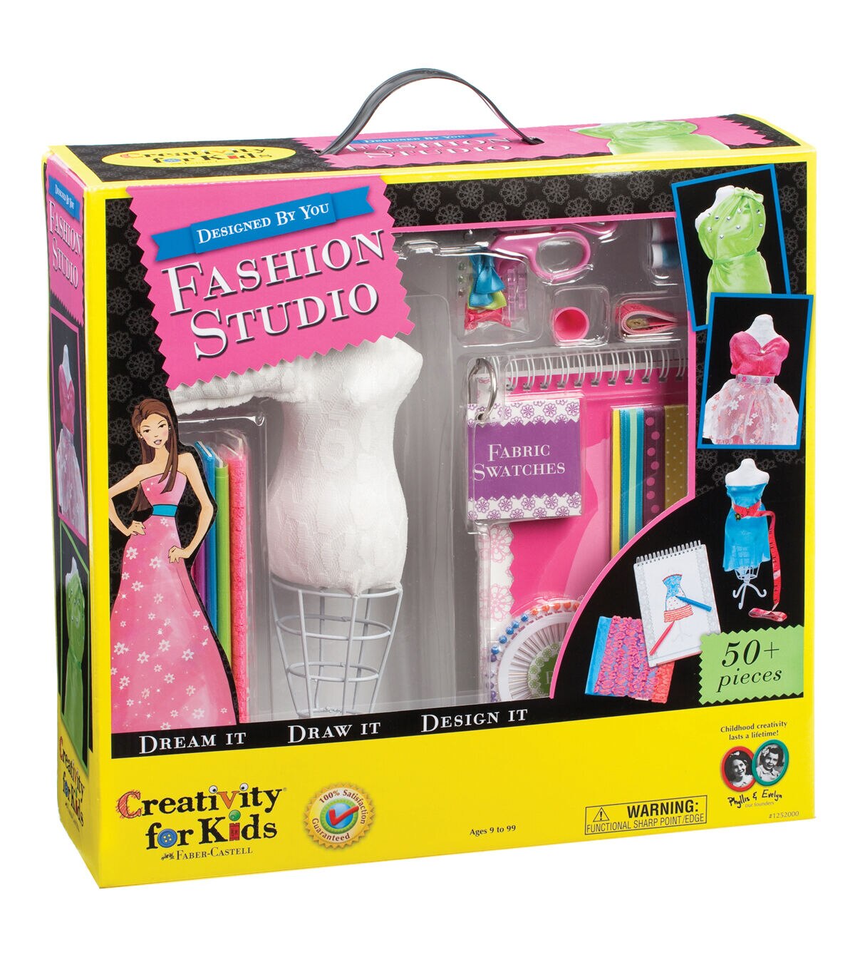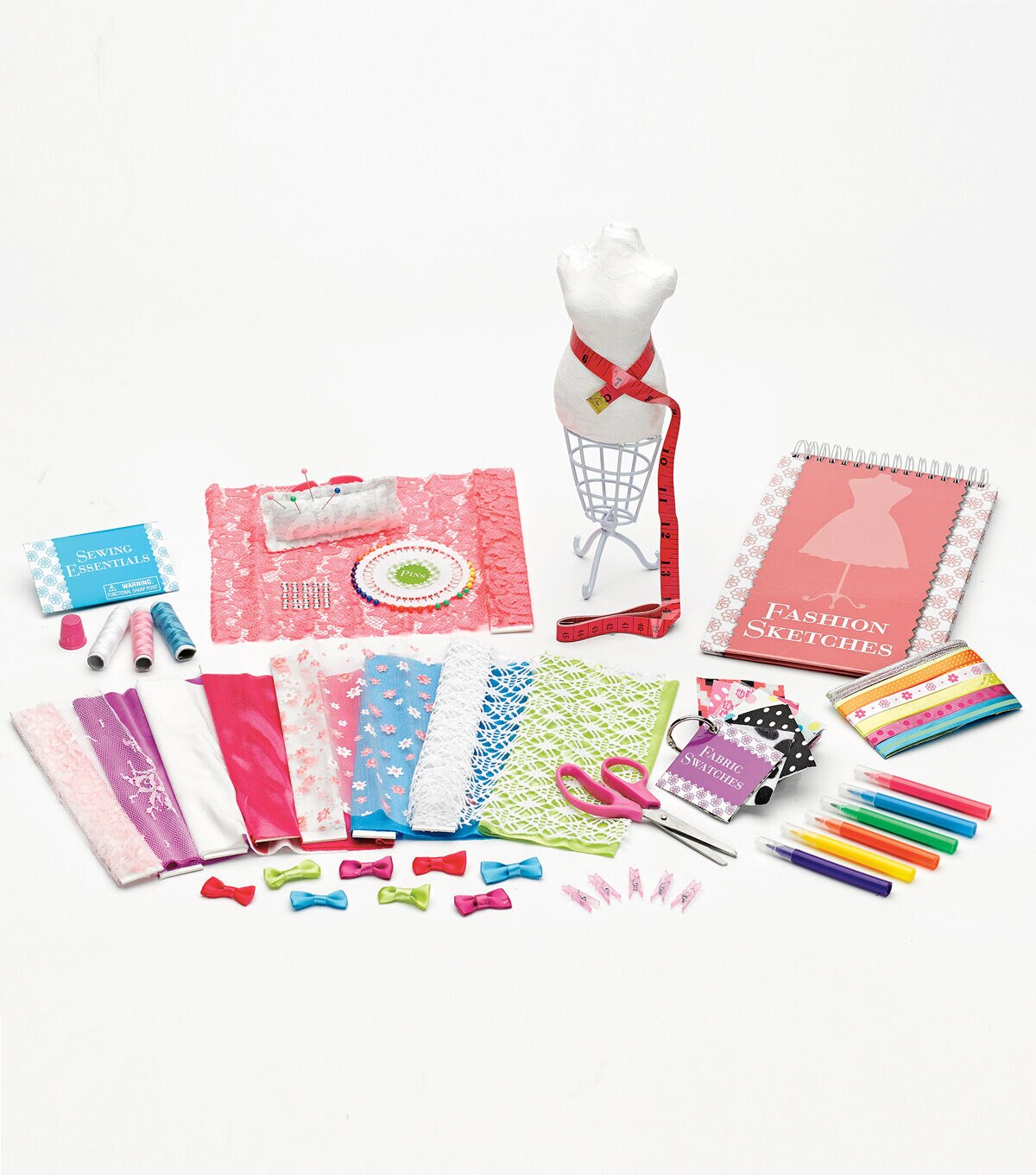 - Includes dress mannequin, satin dress ready for embellishing, garment bag with hanger & spiral-bound sketch book, fabric bolts samples (satin, lace, animal print & sparkle), fur fleece, swatch book, assorted trims (pearls, sequins, satin ribbon & more), 6 spools of thread, Tape measure, scissors, wrist pin cushion, pins, two needles, plastic needle threader, Thimble, dress-makers pencil, craft glue and instruction book with lots of ideas