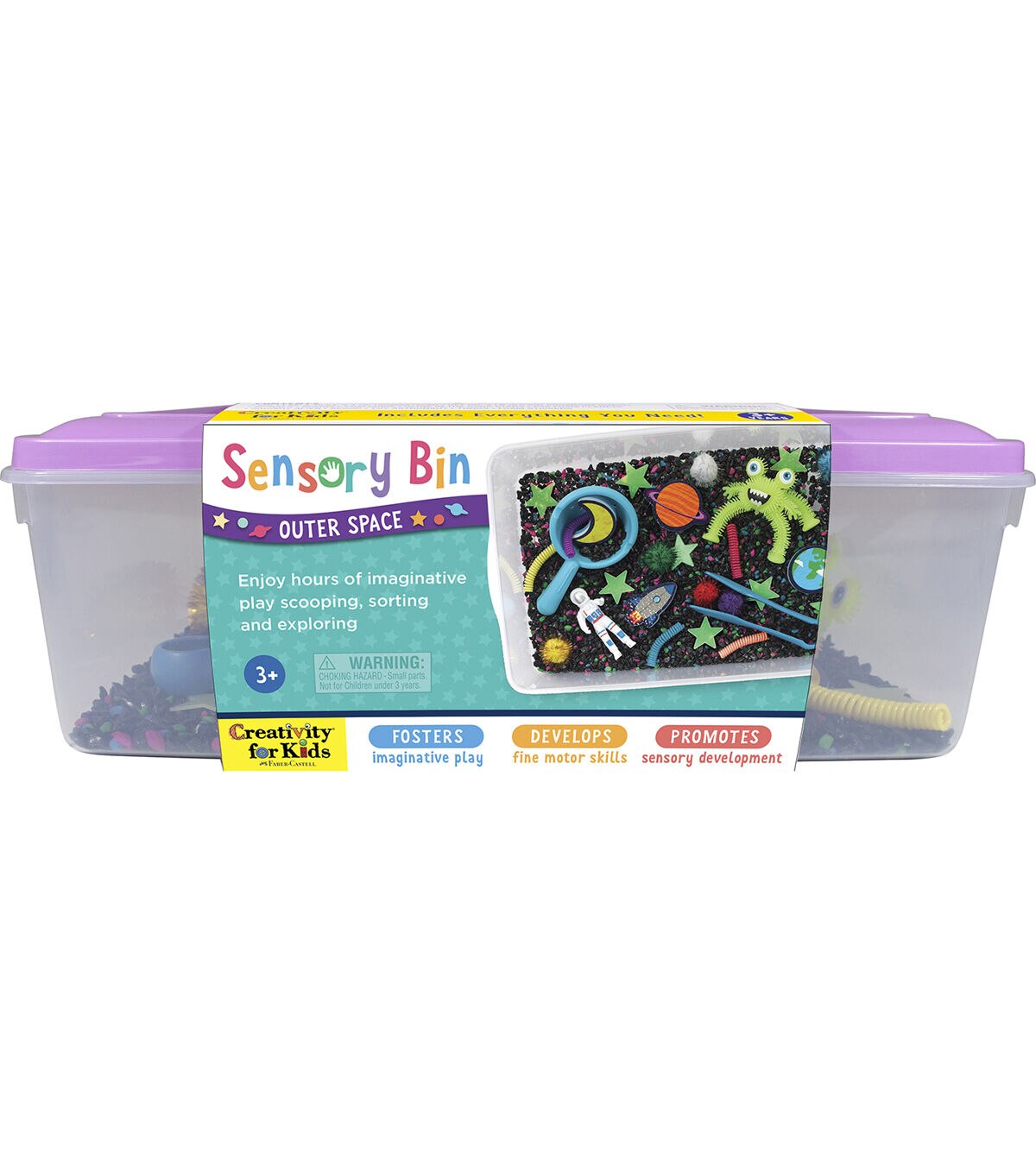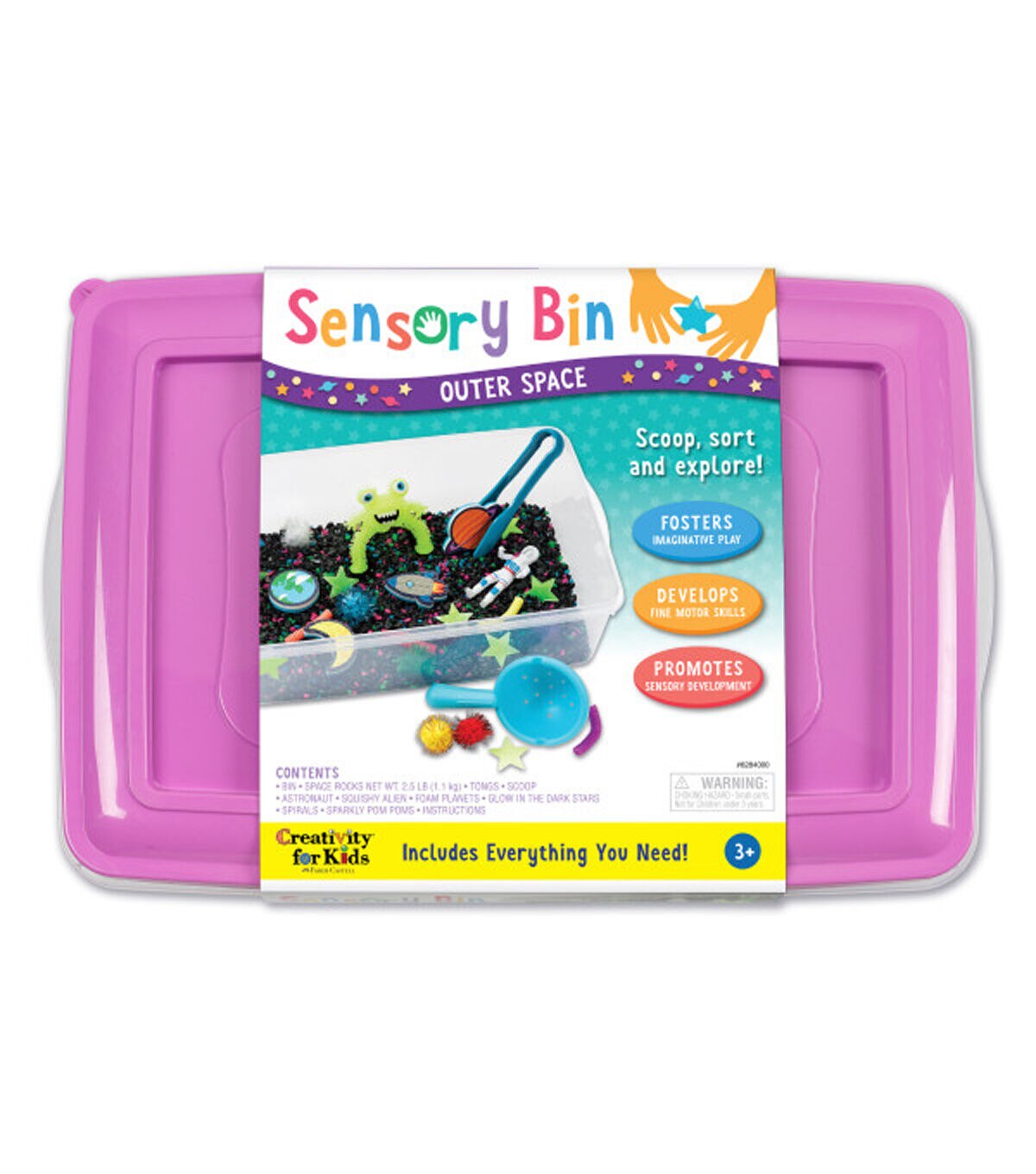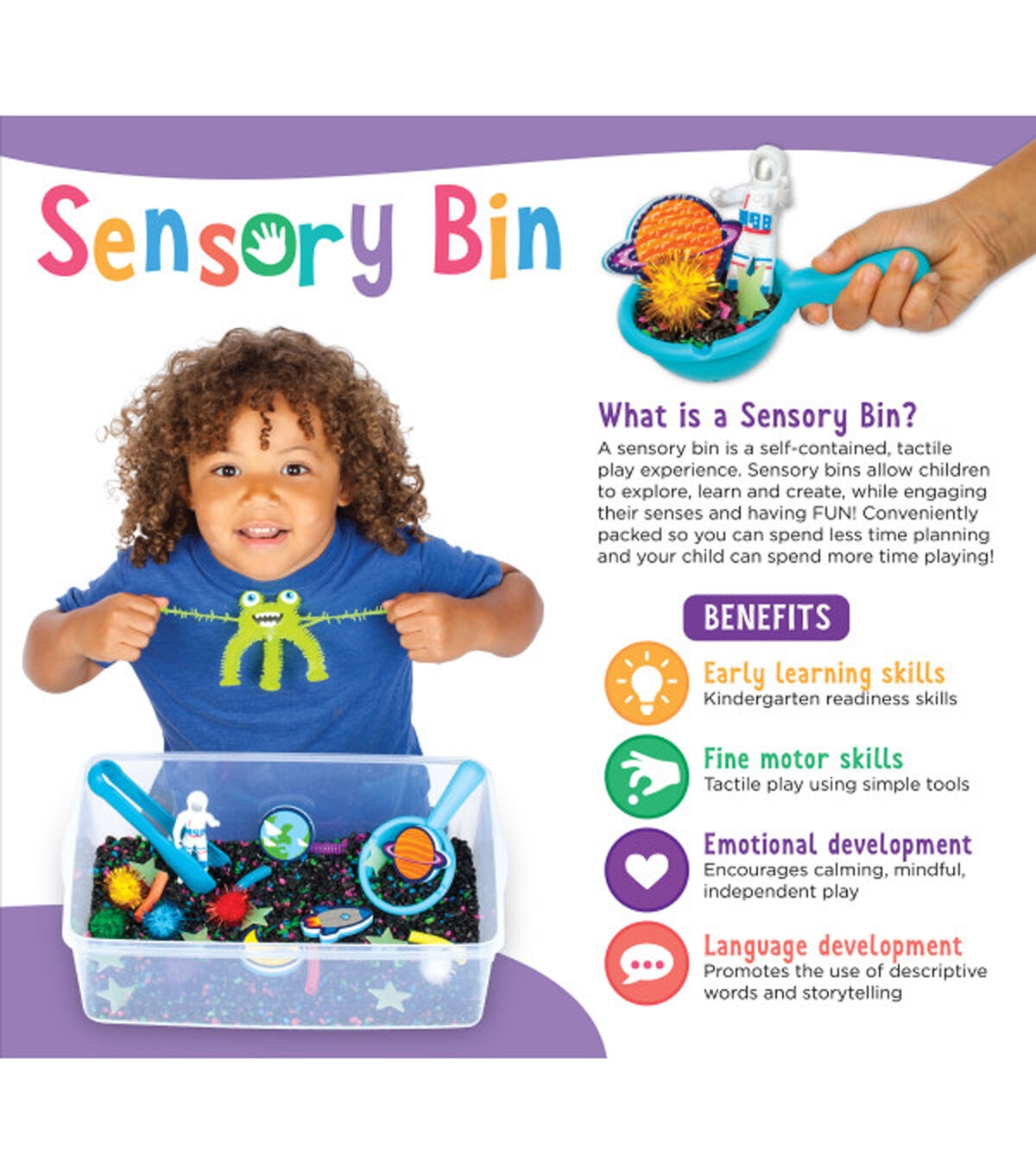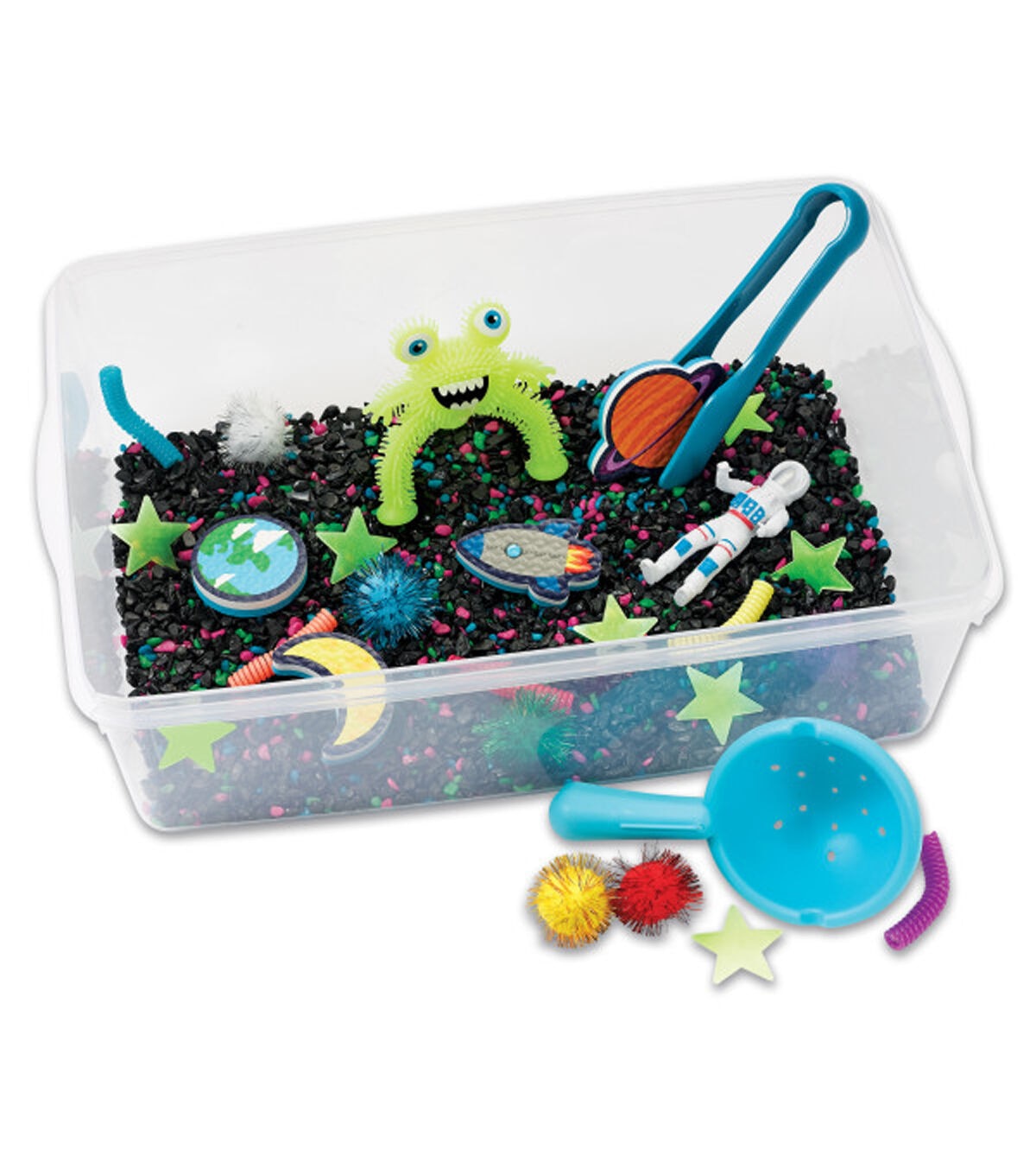 Foster imaginative play with the Outer Space Sensory Bin. This self-contained play bin is the ultimate sensory experience. Develop and practice fine motor movement with scooping, sorting and playing in this self-contained galaxy.