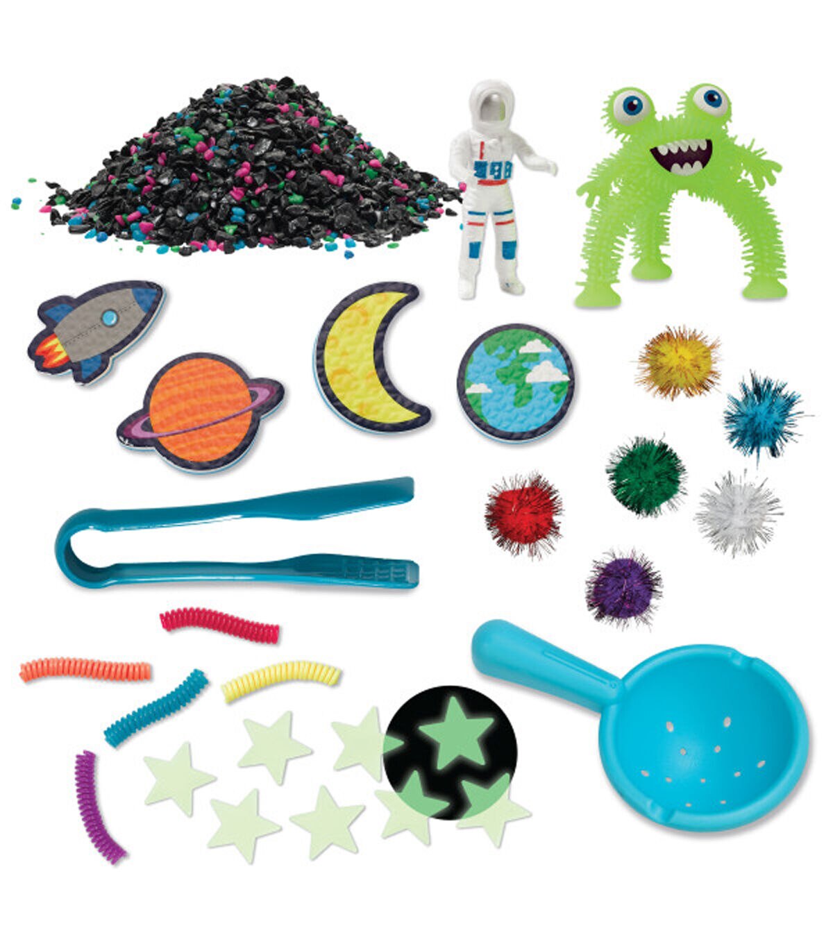 - Includes glow-in-the-dark stars, space rocks, tongs, scoop, astronaut, squishy alien and more!