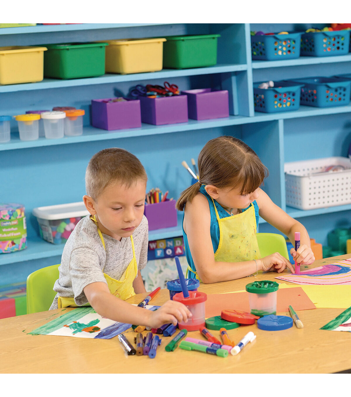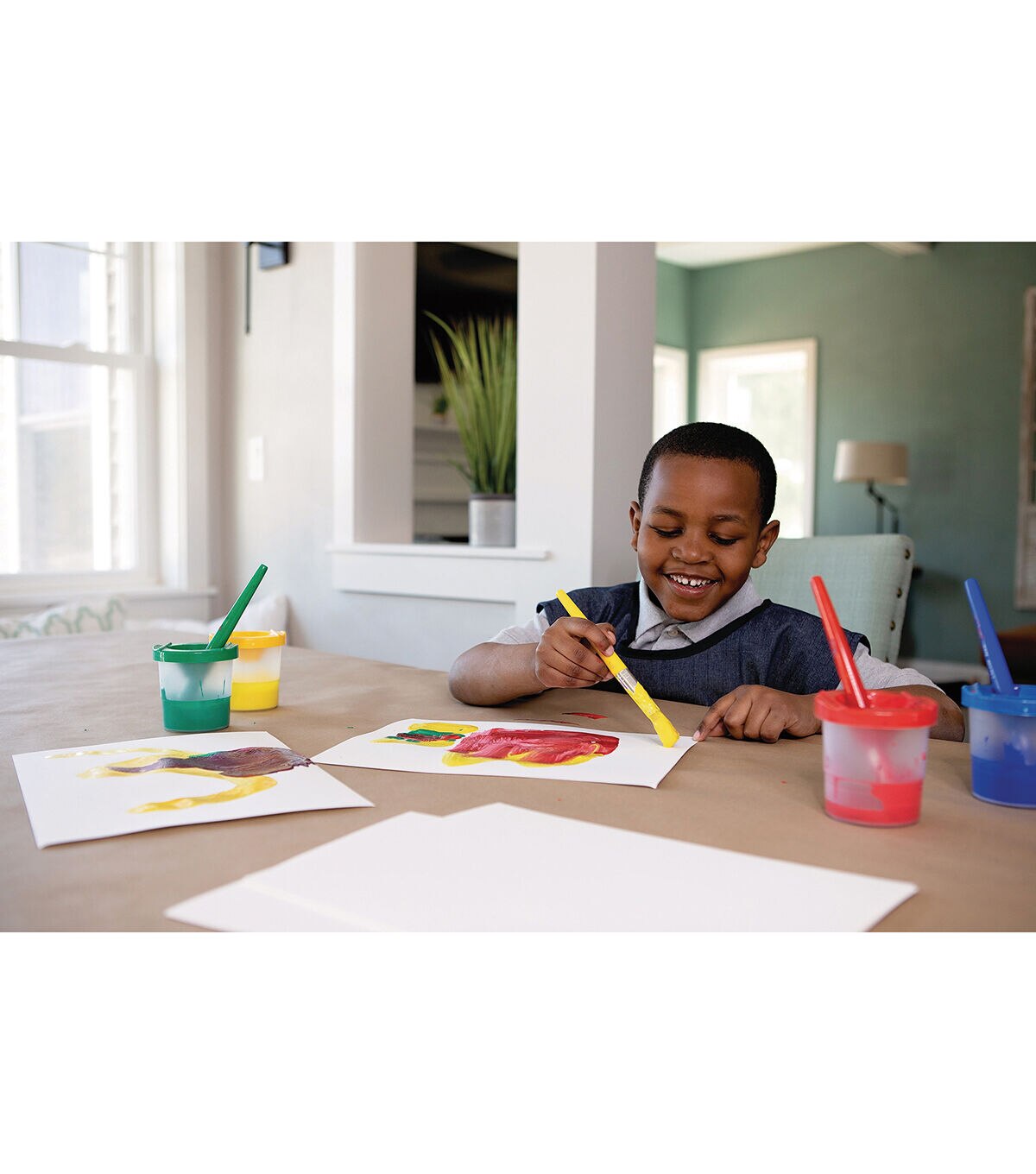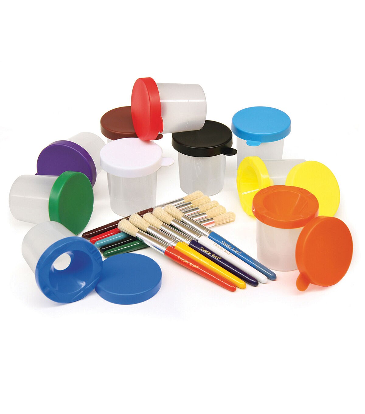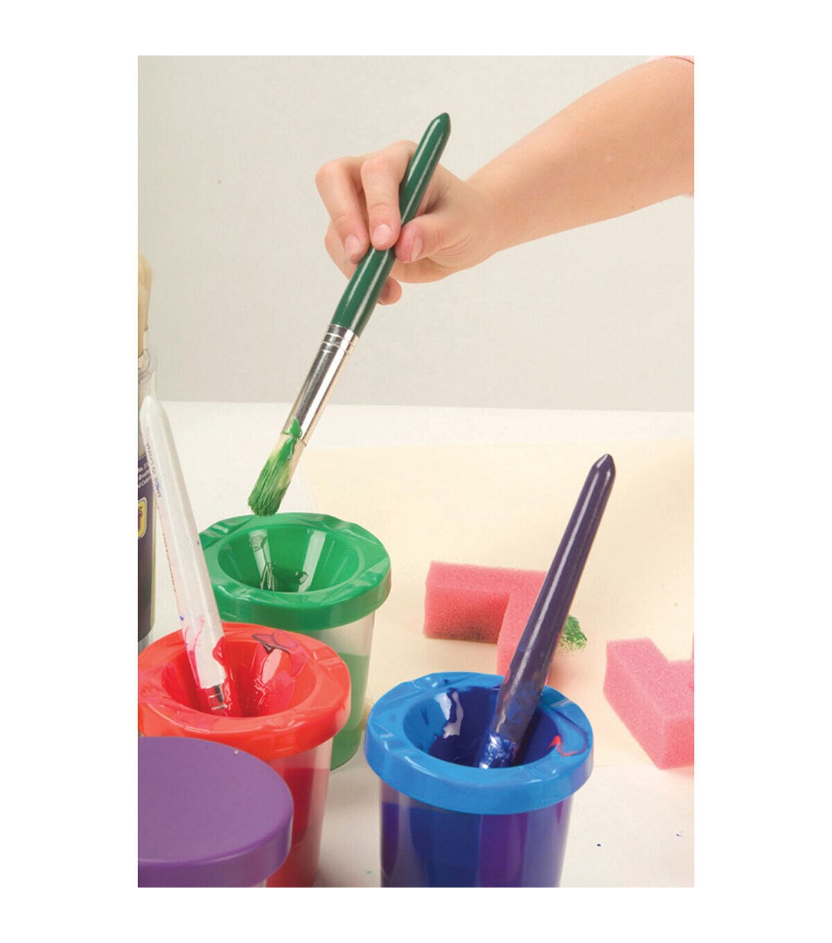 Gift your little ones the Creativity Street No-spill Cups & Coordinating Brushes-Assorted for hours of fun. This set includes 10 color-coordinated brushes and 10 cups. These dual-lid storage cups prevent spilling. The outer lid securely seals the cup, while the inner lid keeps the paint from spilling out if the cups get knocked over. Kids can easily identify the color of the paint inside by seeing the lid.
