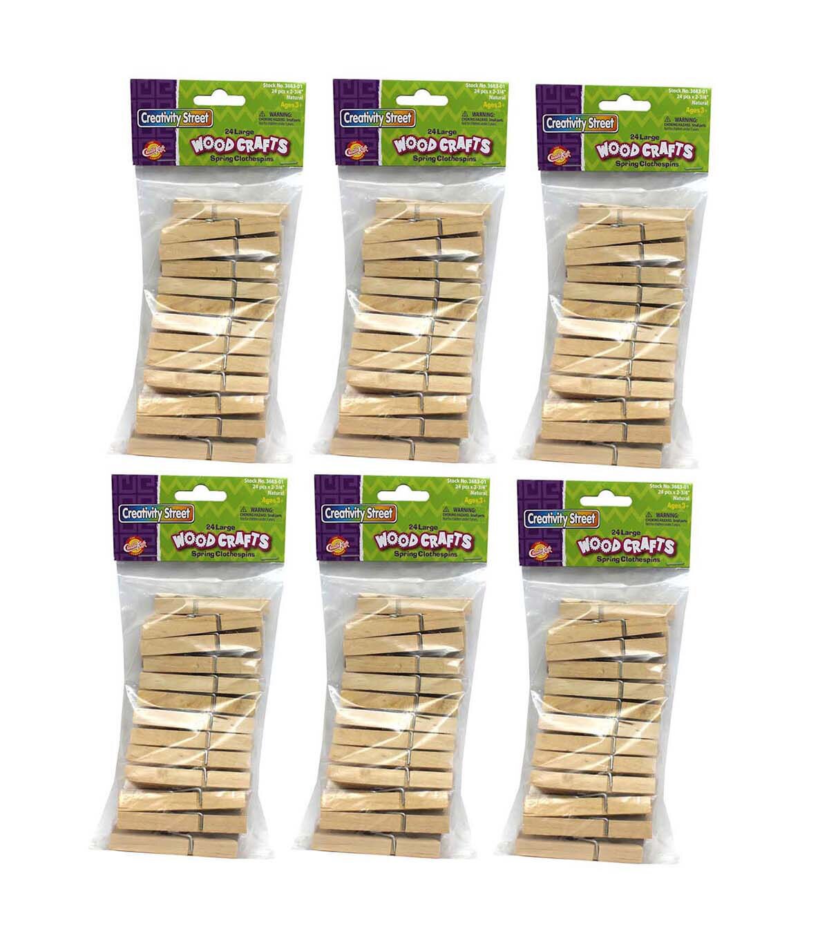 Natural wood spring clothespins are a great addition to any arts and crafts project. They are easy to paint and stain, and can be used to create animals, seasonal decorations, and much more. Large spring clothespins are 2.75" in length, and accept many type of glues. Add thumb tacks for bulletin board accents, or use to hang artwork on a clothesline display. Each pack includes 24 clothespins. Sold as 6 packs for a total of 144 clothespins.