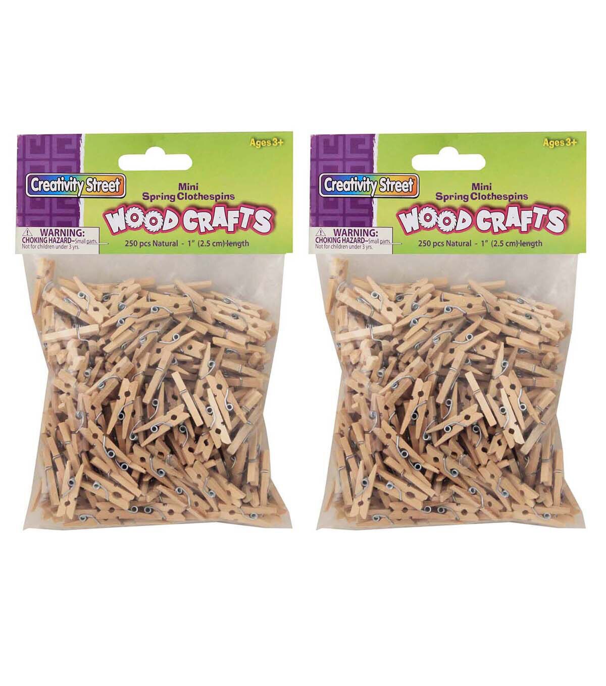 Mini Clothespins have many arts and crafts applications. They can also be used to hang student artwork around the classroom or home. Perfect for all types of craft projects or activities. These natural clothespins measure 1" in length. Each pack includes 250 clothespins. Sold as 2 packs for a total of 500 clothespins.