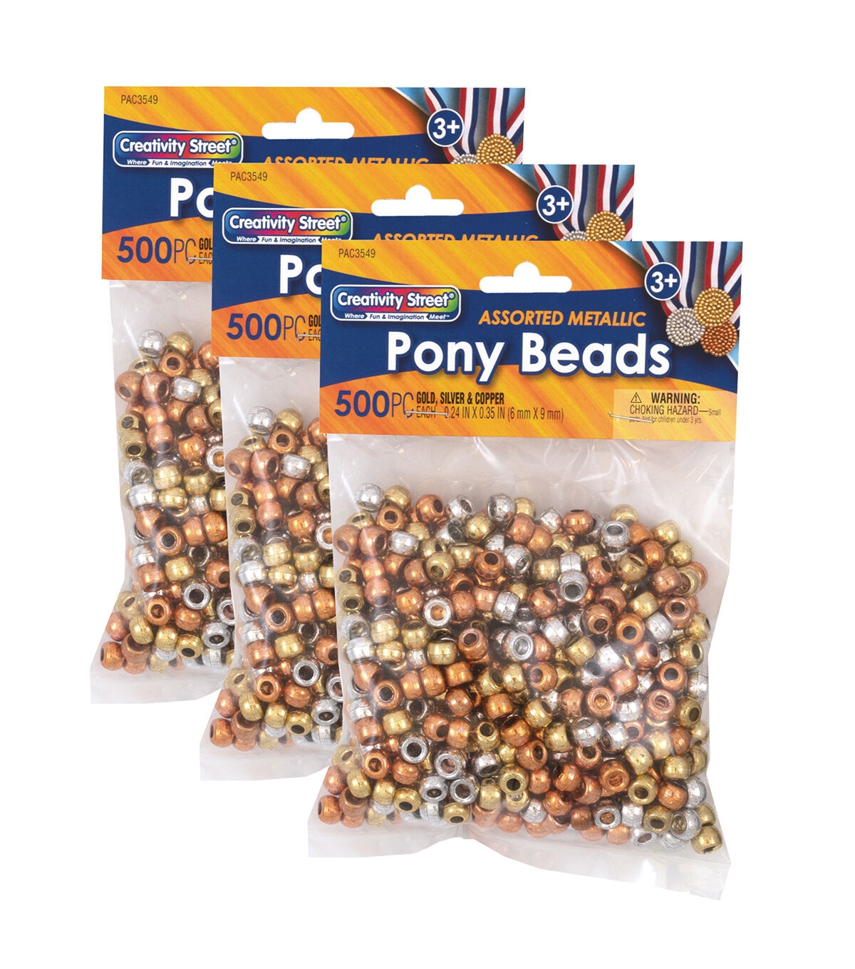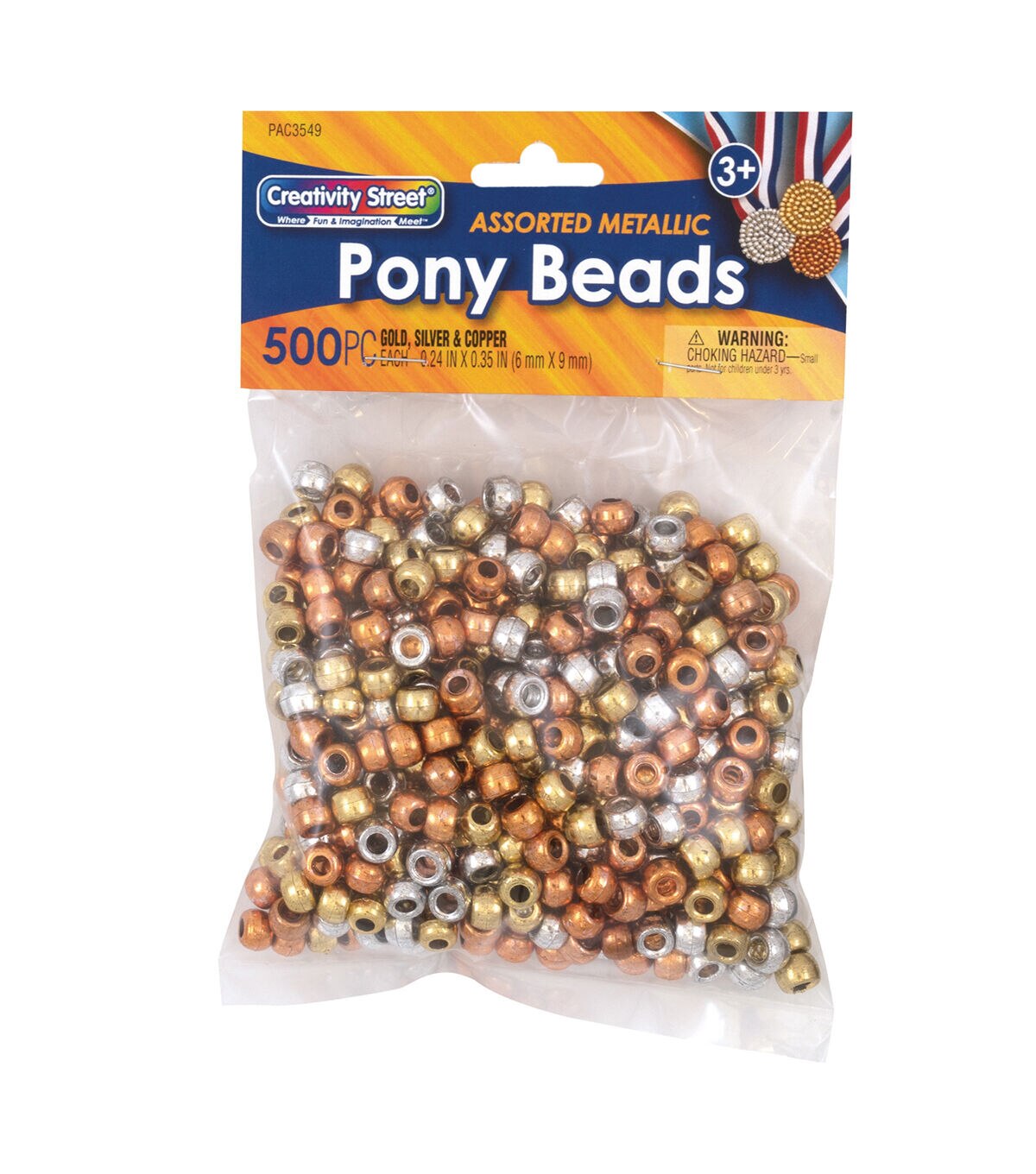 Make your projects or craft jewelry shine with Creativity Street Gold, Silver, and Copper Pony Beads. Lustrous metallic plastic pieces are versatile for every craft project, with the classic hole through the center for easy threading through lace or string. Each bead has 6 x 9 millimeter barrel. Craft beads are great jewelry-making essentials, macramé accents, figurine crafts, key chains, and much more. Sensory beads for bracelets also help with children's development of hand-eye coordination and fine motor skills. Holes in each bead fit most standard shoe laces and other projects for connecting beads. All 500 pieces come in a poly bag with header card. For best care, try to not excessively scratch beads, as shine can rub off. Note that beads (small parts) are a choking hazard; please use careful supervision over children when in use. Safe for ages 3 and up. Sold as 3 packs for a total of 1500 beads.