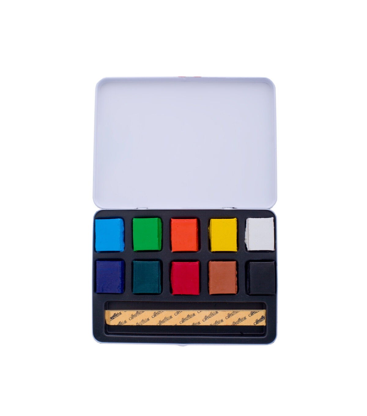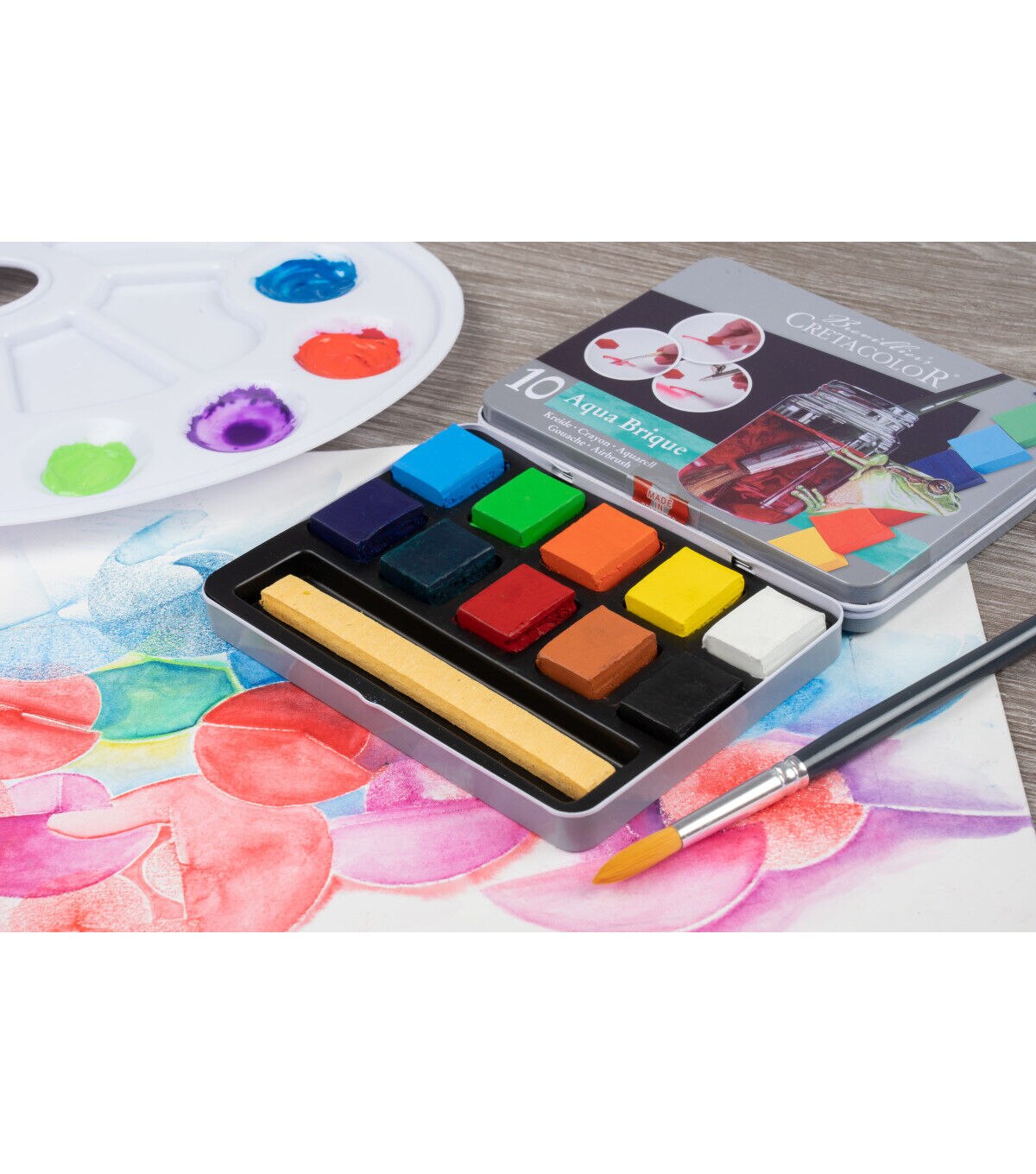 Aqua Brique is a solid water-soluble block of color that can be used on various surfaces such as paper, cardboard, canvas and wood. The convenient pocket-sized tin includes 10 half-briques with an expanding sponge. These extremely lightfast intense pigments can be diluted with water to use with an airbrush, or used as watercolor half-cakes. They have spectacular luminosity on dark surfaces and adhere to non-porous surfaces. The convenient pocket-sized tin includes 10 half-briques with an expanding sponge. The set includes cadmium yellow, permanent dark yellow, orange, carmine extra fine, magenta, sky blue, Prussian blue, emerald, sienna natural and ivory black.