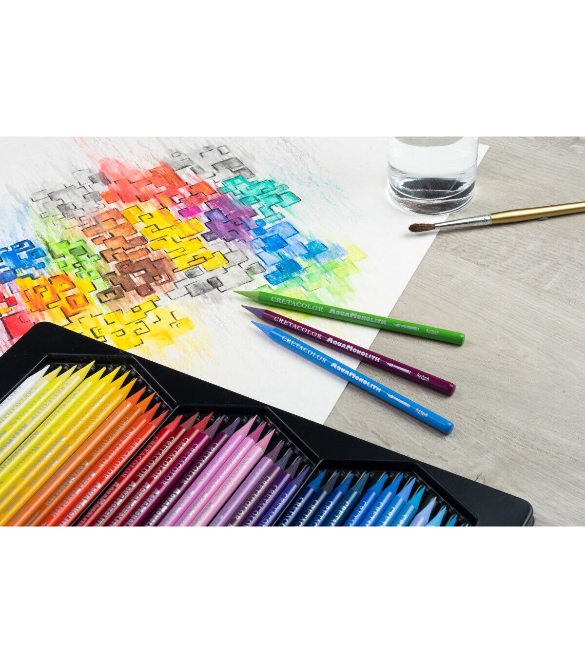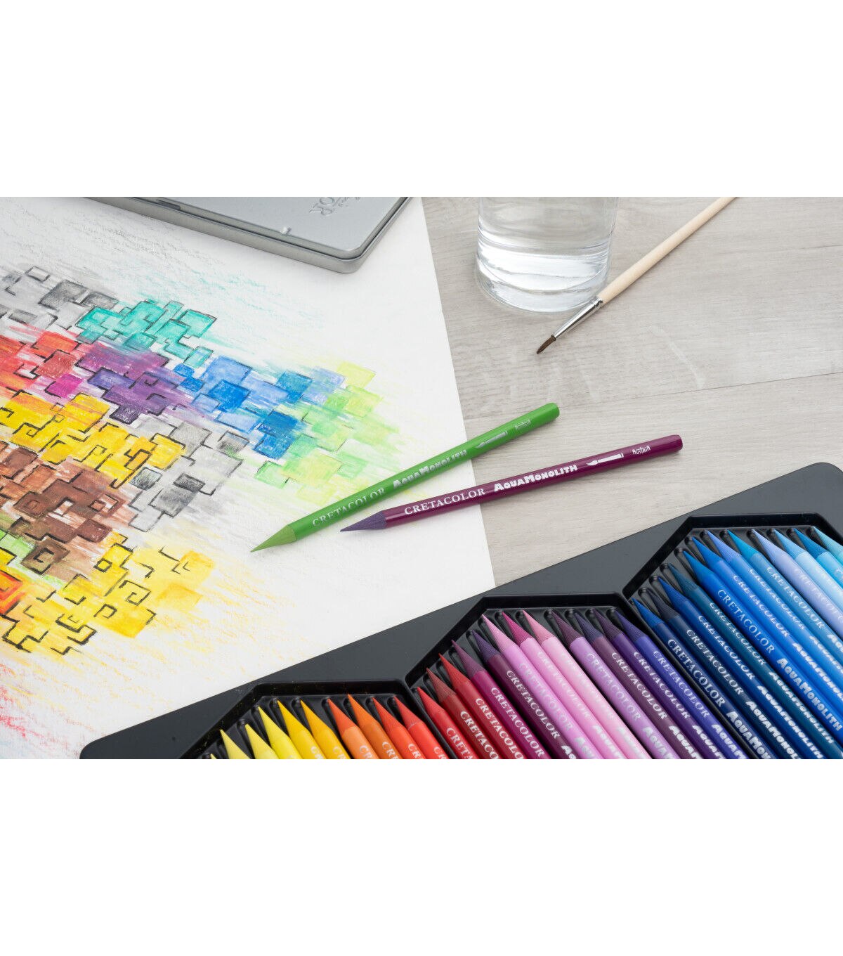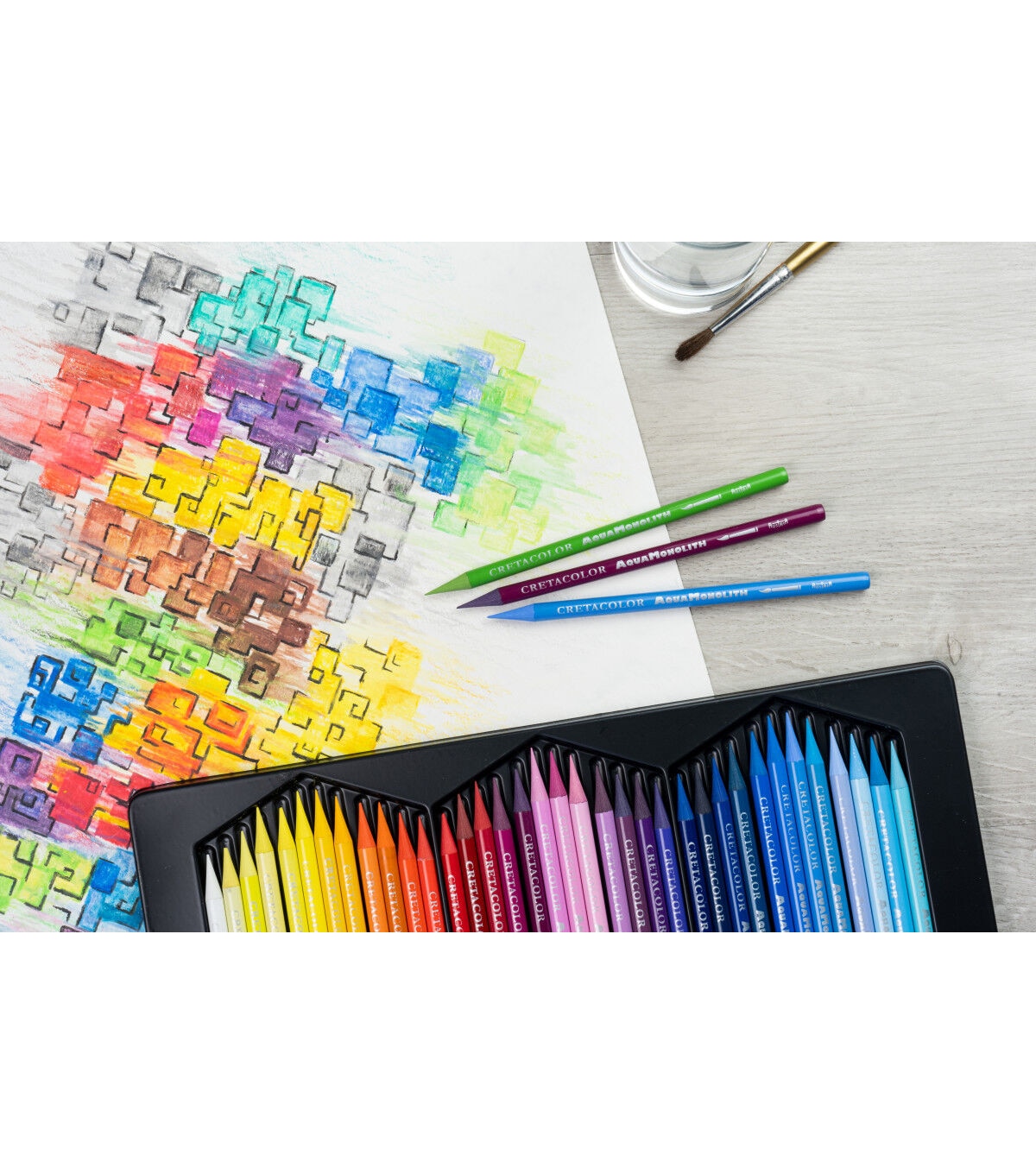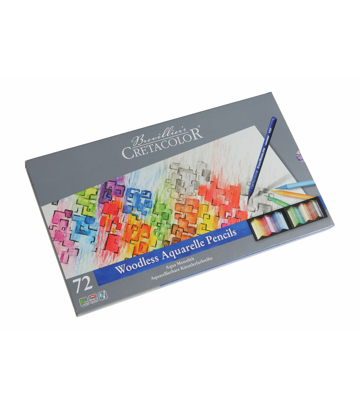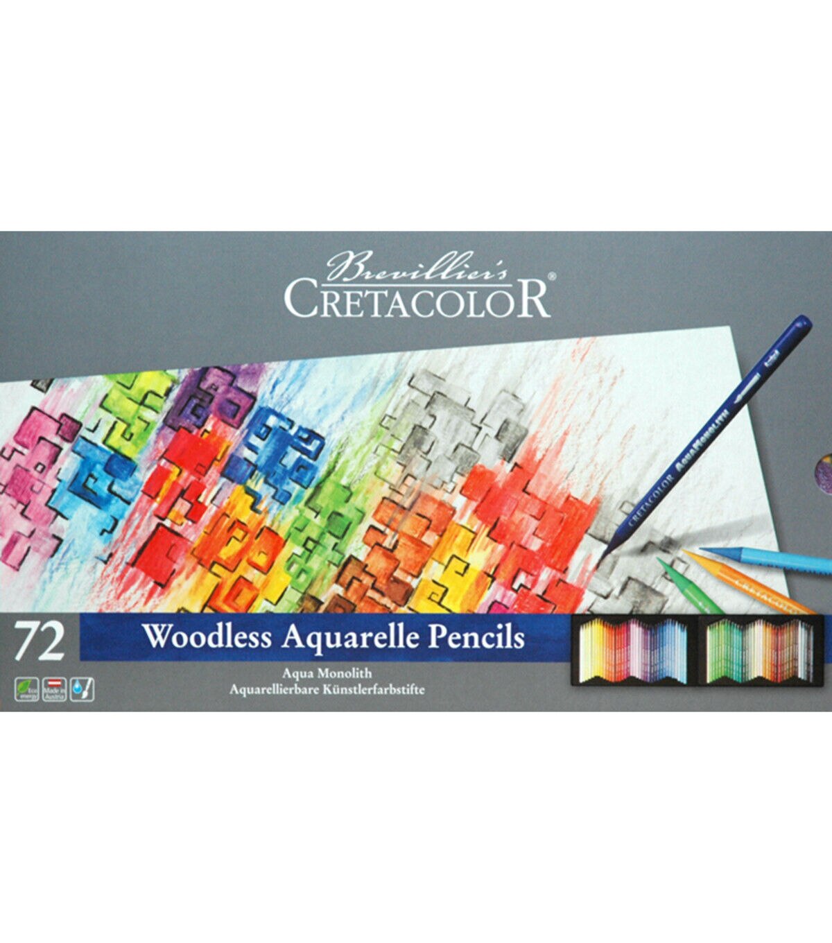 These highly pigmented, woodless colored pencils have the added advantage of being water-soluble. They impart rich colors and soft strokes in 72 brilliant shades. Each pencil consists of 7mm in diameter of pure colored lead without any wooden casing. Both bold applications or fine details can be achieved with the same pencil. They are easily sharpened and can be used dry or wet by submerging the pencils into water and drawing directly onto paper or brushing over the dry strokes with water. This set contains 72 pencils. Colors include Blue Gray 237, Blue Violet 156, Bremen Blue 163, Cadmium Yellow 107, Carmine Extra Fine 116, Chestnut Brown 215, Chromium Yellow 108, Cobalt Blue 154, Cyclamen 134, Dark Gray 235, Delft Blue 153, Emerald 177, English Red 209, English Rose 132, Fir Green 179, Flash Yellow 104, French Green 183, Glacier Blue 151, Graphite Aquarell 260, Grass Green 184, Green Earth Dark 190, Green Earth Light 189, Indian Red 212, Indigo 162, Ivory 201, Ivory Black 250, Leaf Green 178, Light Blue 158, Light Gray 232, Light Green 180, Lime Green 185, Madder Carmine 117, Magenta 128, Mars Violet Dark 140, Mars Violet Light 125, Medium Blue 159, Moss Green Dark 182, Moss Green Light 181, Mountain Blue 157, Naples Yellow 105 ,Ochre Dark 203, Ochre Light 202, Old Rose Dark 136, Old Rose, Light 135, Olive Brown 216, Olive Green Dark 191, Olive Green Light 188, Orange 111, Pastel Blue 150, Pea Green 187, Permanent Dark Yellow 109, Permanent Red Dark 115, Permanent Red Light 113, Permanent White 101, Pompeian, Red 213, Prussian Red 213, Red Brown 211, Sepia Light 218, Sienna Natural 204, Smyrna Blue 164, Straw Yellow 106, Sunproof Yellow Citron 103, Tan Dark 130, Tan Light 131, Turquoise Dark 176, Ultramarine 155, Umber 221, Umber Green, Light 192, Van Dyke Brown 220, Vermilion Dark 114, Vermilion Light 112, Violet 138.