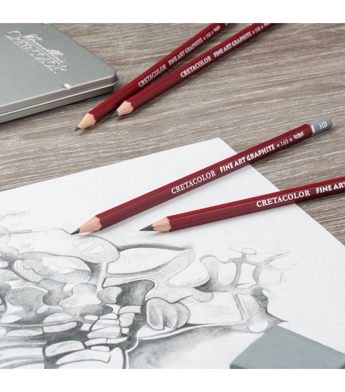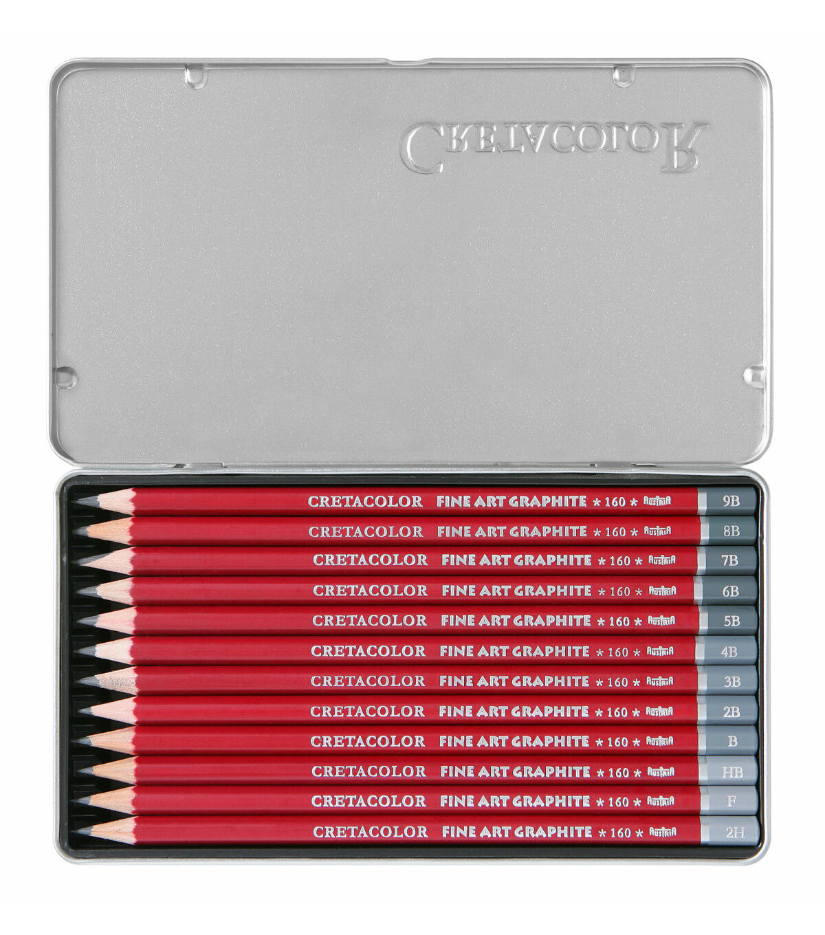 These pencils are exceptionally strong and can be sharpened to a clean, fine point. The set comes with a tin for storage and is perfect to take to art class. It includes one pencil of each hardness level: 2H, F, HB, and 2B-9B.