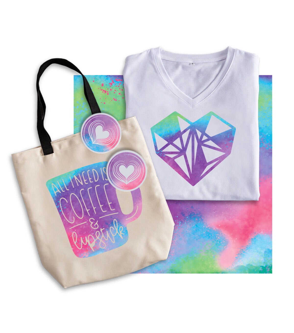 Make a DIY splash with whimsical watercolor. Get ready for the next hottest thing in heat transfers! Customize T-shirts, totes, and more with pro-level transfers that last a lifetime. Personalize any compatible Infusible Ink™ blank with a name, logo, inside joke, or favorite quote using your Cricut® cutting machine and these ready-to-cut sheets in complementary patterns. When transferred using high temperatures, these pre-inked sheets blossom into vibrant, vivid hues before your eyes. The end result is vivid, brilliant, seamlessly smooth transfers that are peel-proof, flake-proof, and wash-proof! Combine with complementary Infusible Ink Pens & Markers or solid colors for truly unique creations.