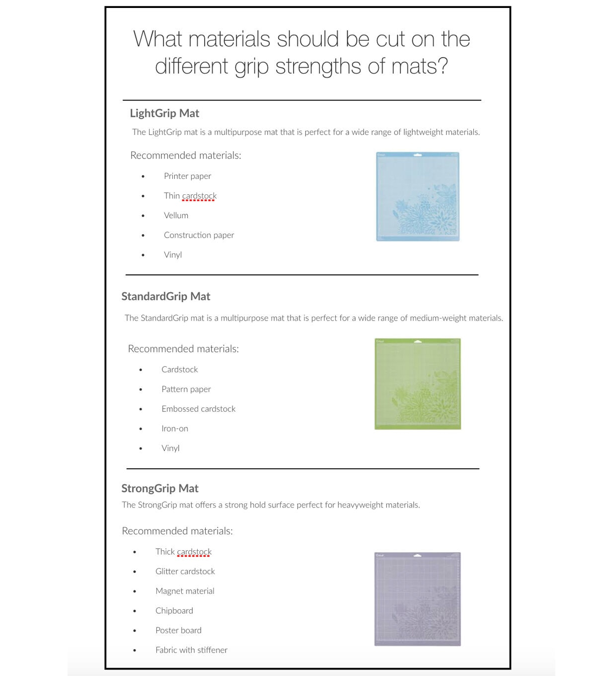 The mats in this Cricut Machine Mat Variety Pack have been customized to match commonly used crafting materials. Each of the three mats has just the right level of grip to not only hold your material firmly in place during cutting, but also to allow you to easily remove the material from the adhesive surface. The StandardGrip mat is a multi-purpose mat that is perfect for a wide range of medium-weight materials, including patterned paper, vinyl, iron-on and cardstock. Specially formulated for lightweight materials, the long-lasting LightGrip mat allows you to easily cut and remove common office printer paper, vellum, light cardstock and more. The StrongGrip mat offers a strong hold surface perfect for heavyweight materials such as specialty cardstock, glitter cardstock, chipboard and fabric with stiffener. It’s a long-lasting mat featuring double life adhesive technology. This pack includes three 12 x 24-inch cutting mats in three different grips. Use with Cricut Explore family and Cricut Maker machines.