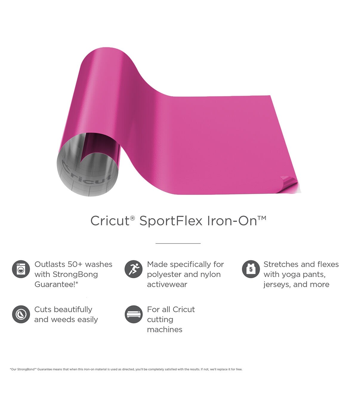 Made especially for activewear, the Cricut StrongBond SportFlex Iron-on Sheet-Black features the StrongBond Guarantee for long-lasting iron-on results that stick. Run, swing, kick, dance, do that cobra pose and more wearing this flexible, stretchable iron-on material that bends with the body and keeps uniforms and team gear lightweight. Customize team jerseys, or embellish uniforms, caps, yoga tops, leggings and more. It is highly recommended for tech fabrics like polyester and nylon. Use with all Cricut cutting machines. This pack includes an 11.8 x 24-inch SportFlex iron-on material. Easy to weed and apply, use your household iron or Cricut EasyPress.