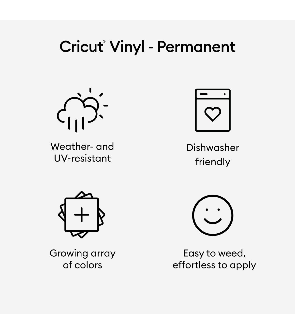 Every project goes smoothly when you use the Cricut Permanent Glossy Premium Vinyl. You can take it outside as it will weather the storm. It lies flat on your cutting mat without tunneling or bubbling. You'll weed it with ease and apply with awe. Even complex designs effortlessly lift from the carrier sheet for a perfect application. Water-resistant and UV-resistant, this vinyl will last up to three years, even in the great outdoors. You can use it with all Cricut cutting machines.