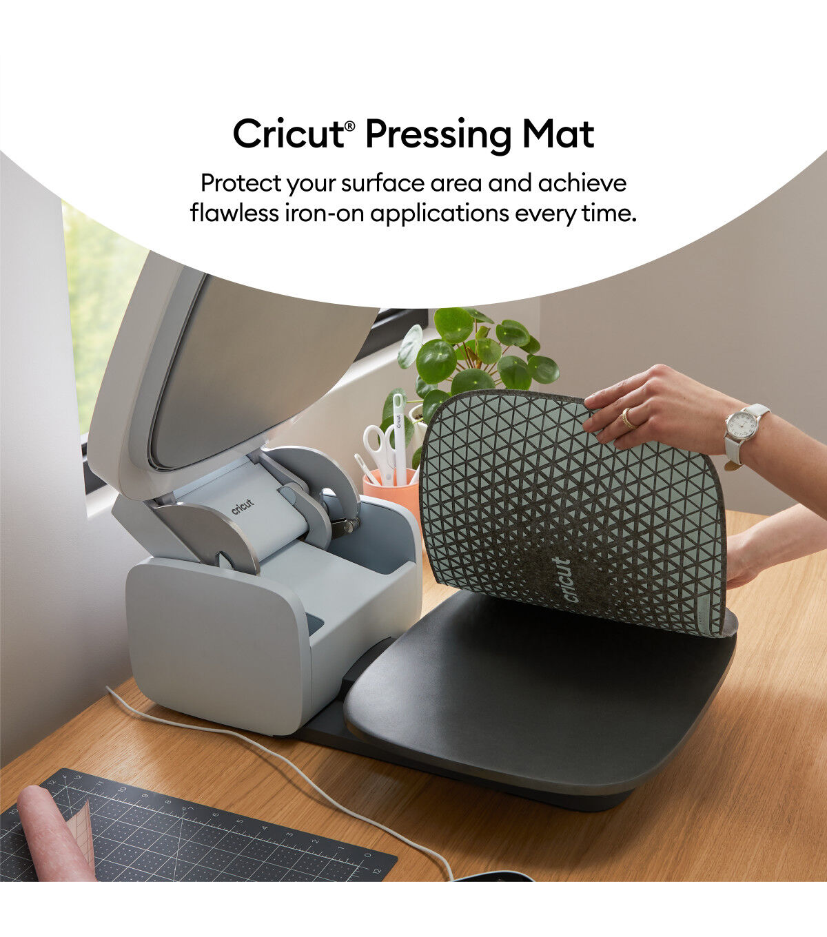 Shield your surface area and get amazing heat-transfer results with this essential Cricut Autopress companion. The durable cover absorbs and distributes heat across your project. A special inner liner wicks moisture for clean, dry heat. A foil membrane reflects heat and prevents moisture vapor transfer. The silicone foam insulates and protects your surface from damaging heat. Prep while you press on a second mat, as a nonslip silicone base seals the layers together and keeps your mat in place.