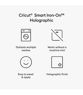 Glimmer, shine, and give your projects a groovy look with Smart Iron-On Holographic. This clever crafting material works without a machine mat – just load and go. Adding a touch of shine to your projects has never been easier. Smart Iron-On works fabulously on a wide variety of materials. For use with Cricut Venture. For effortless application, use Cricut EasyPress. Care Instructions • Allow 24 hours after application before washing. • Wash and tumble dry inside out. • Do not bleach. • If you need to iron, only iron on the backside of the garment.