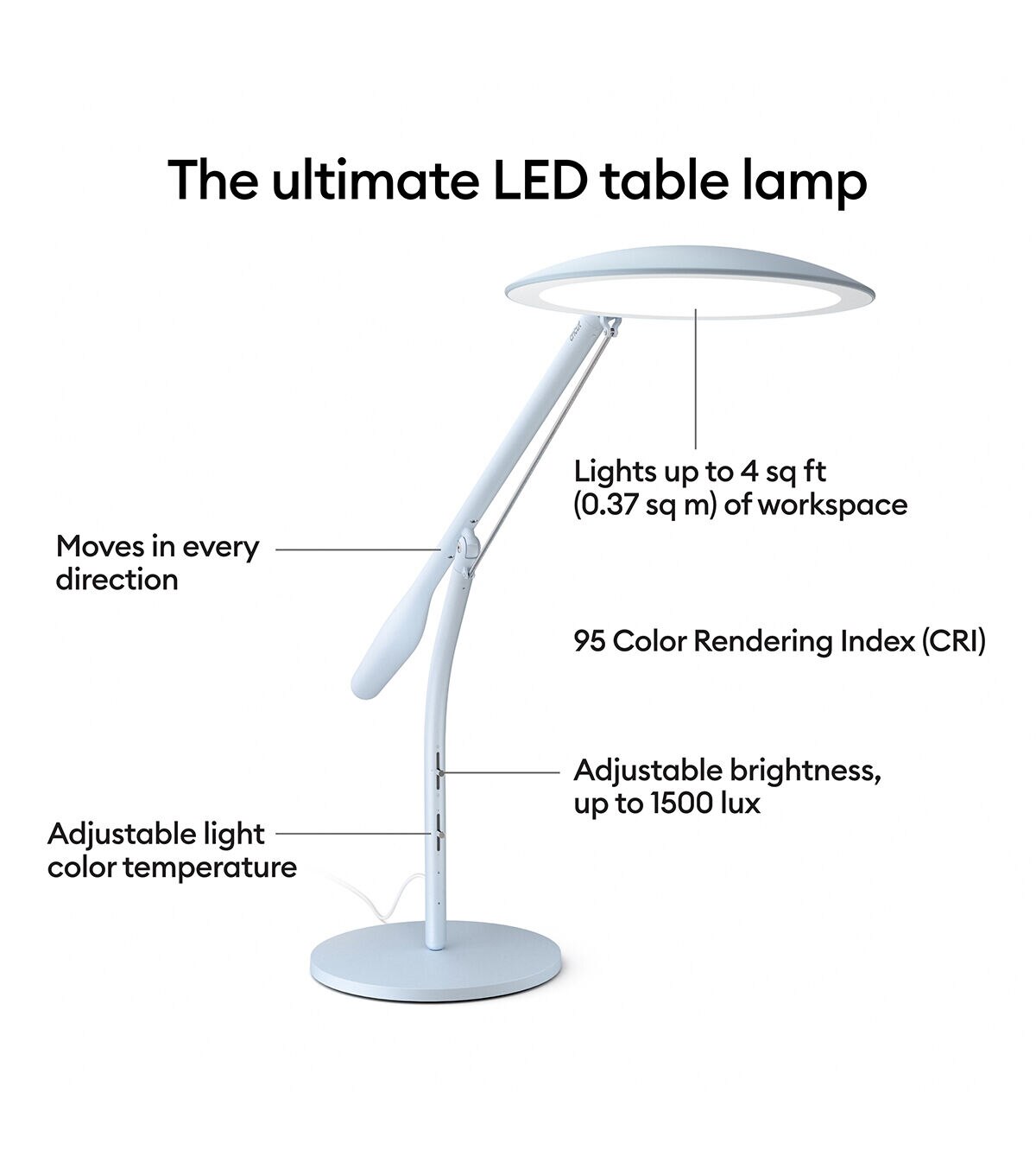 - Adjustable brightness up to 1500 lux, plus light color temperature from warm to cool white