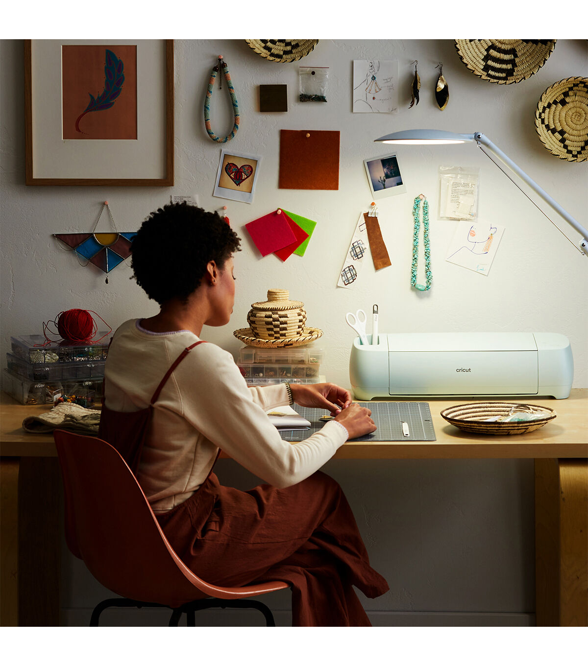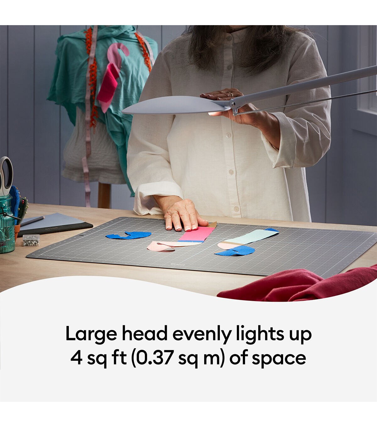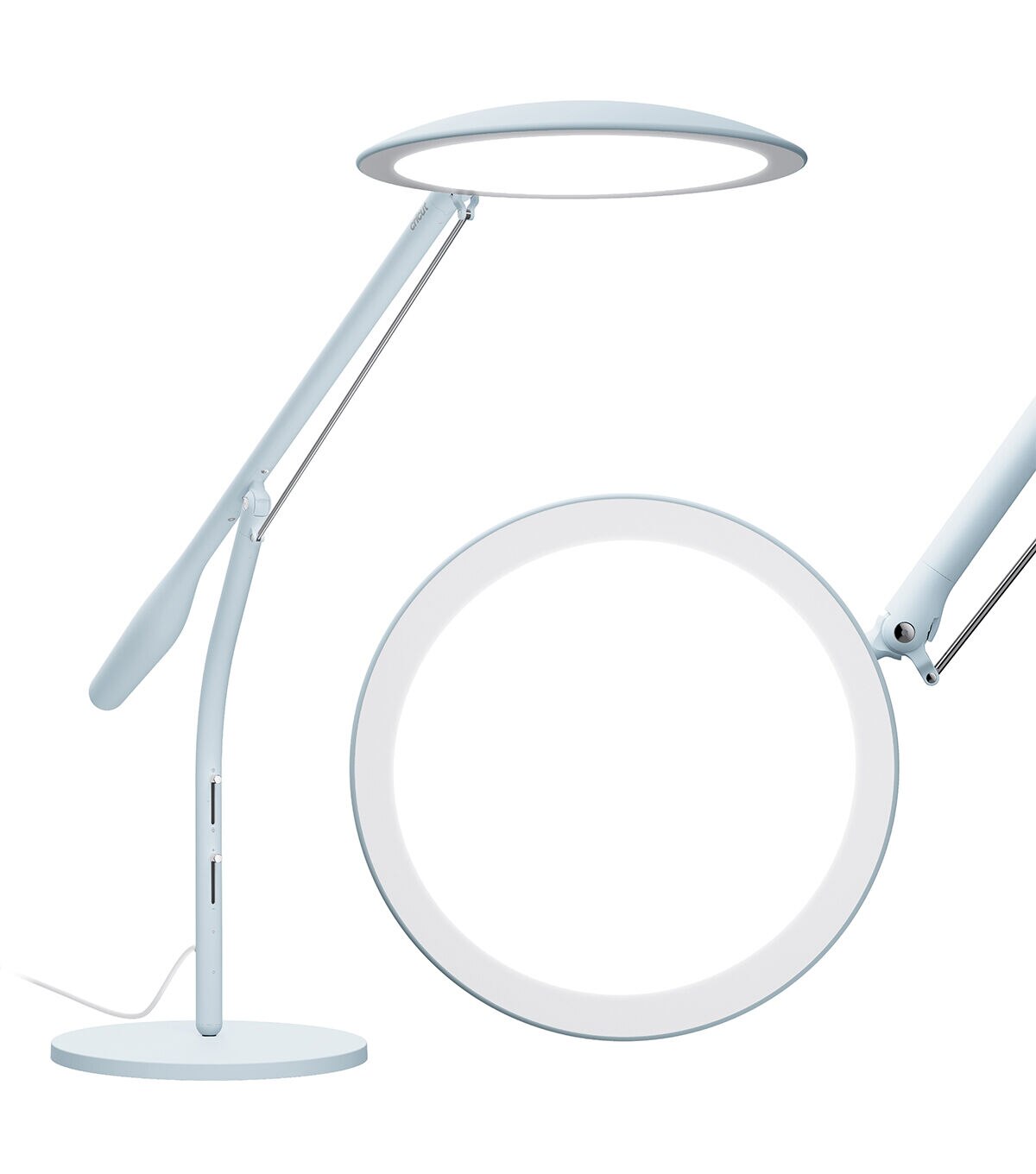 See your projects in a whole new light with Cricut Bright 360, the ultimate LED table lamp. Its large, broad head evenly lights up your entire workspace. With a gentle push of the hand, the lamp pivots, rotates, and easily glides into the just-right position for every craft. Whether you're working on a delicate accent piece or searching for the perfect matching shade, you'll see colors and details with exceptional clarity. A high 95 CRI (Color Rendering Index) means your colors will appear more accurately than with a traditional bulb. Use the sleek sliders to adjust brightness (up to 1500 lux) as well as light color temperature (warm to cool white) to cast ideal light in any space. Comfortably see every detail with less glare, hotspots, and eye strain. From mid-craft to final project photos, Cricut Bright 360 shines light your way.