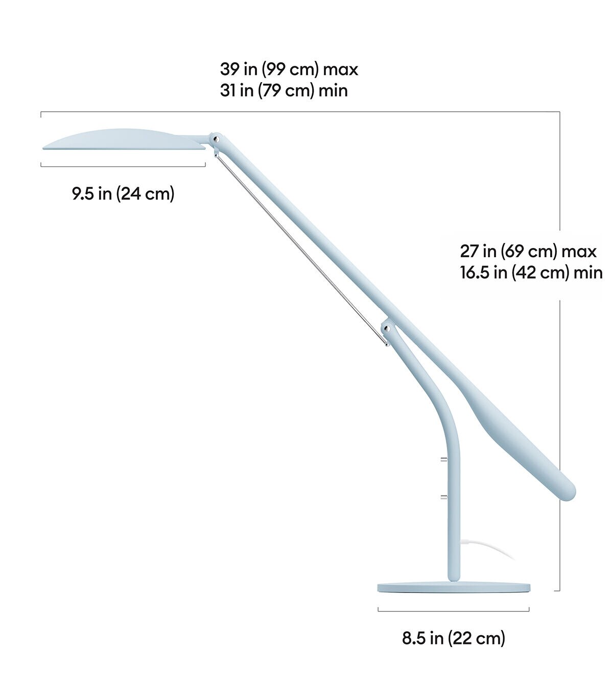 - Table lamp dimensions: D: 8.5 in, W: 31 - 39 in, H: 16.5 - 27 in (D: 22 cm, W: 79 - 99 cm, H: 42 - 69 cm)