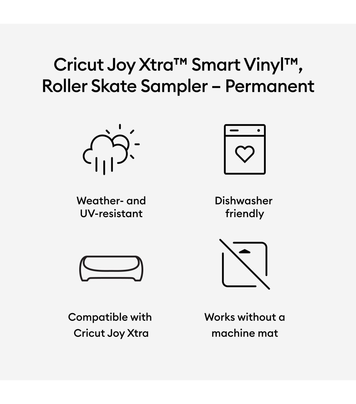Creating personalized projects, big or small, is a snap with Smart Vinyl. This nifty material lets you make more in less time, no machine mat needed – just load and go. Cut a quick decal for your water bottle, lettering for a school project, or create a bold banner in minutes. This vinyl is weather-resistant, so it’ll last even in the great outdoors. For use with Cricut Joy Xtra. *Not intended for food or mouth contact. Carefully follow instructions at cricut.com/help/dishwasher-friendly