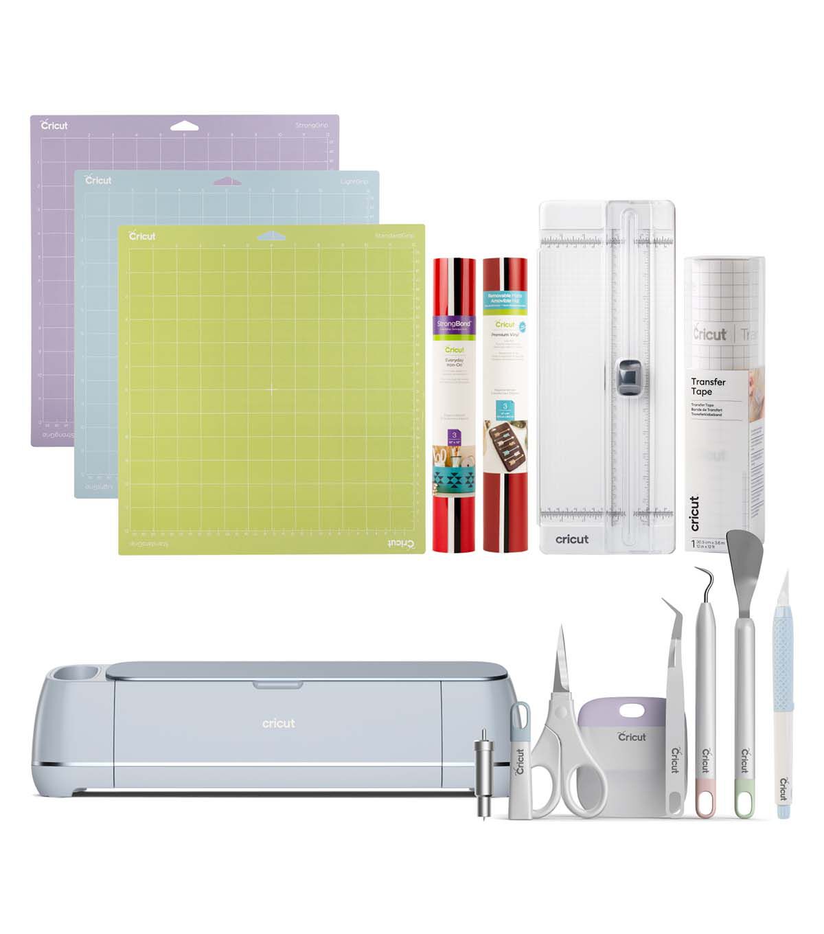 - Includes: Cricut Maker 3 machine, Premium Fine-Point Blade + Housing, Welcome card, USB cable, Power adapter, Free trial subscription to Cricut Access™ (for new subscribers) and 100 free pre-designed projects in Design Space. Bundled with: Cricut® Everyday Iron-On; Elegance Sampler, 12 in x 24 in (30.4 cm x 60.9 cm) (3 sheets); Cricut Premium Vinyl – Removable, Elegance Sampler, 12 in x 12 in (30.4 cm x 30.4 cm) (3 sheets); Cricut Transfer Tape, 12 in x 4 ft (30.4 cm x 1.2 m); Cricut TrueControl Knife in Blue; Cricut Machine Mat Variety Pack, 12 in x 12 in (30.4 cm x 30.4 cm) (3 ct); Cricut Basic Tool Set; Cricut Portable Trimmer, 13 in (33 cm)