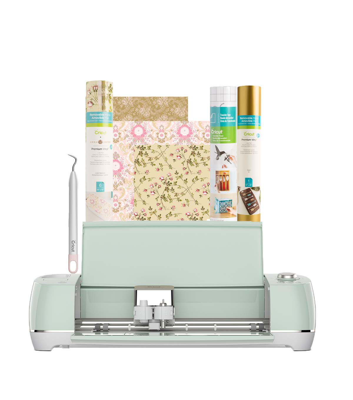 - Bundled With: Cricut Premium Vinyl™ – Removable, Anna Griffin Juliet (6 sheets); Cricut Premium Vinyl™ – Removable, Gold (2 ft); Cricut Transfer Tape (2 ft) ; Cricut Weeder, Rose Pink