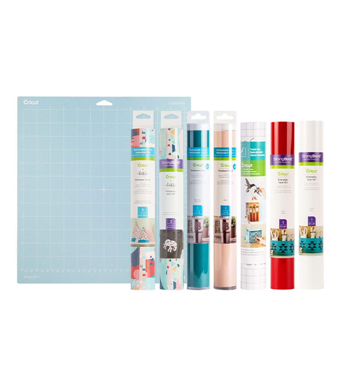 - • Cricut ‘Hostess with the Mostess’ Modern Cheer Iron On Sampler • Cricut ‘Hostess with the Mostess’ Modern Cheer Vinyl Sampler • Cricut Everyday Iron On Red • Cricut Everyday Iron On White • Cricut Premium Vinyl Permanent Blue Green • Cricut Premium Vinyl Permanent Melon • Cricut Vinyl Transfer Tape • Cricut Lightgrip Cutting Mat 12” X 12”