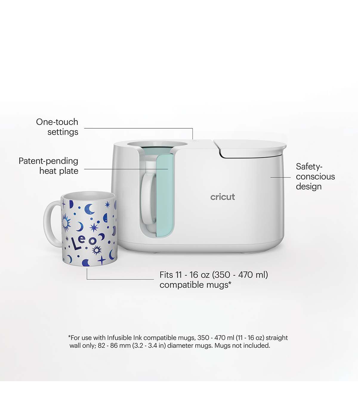 Give the gift of vibrant, professional-quality, personalized mugs with cricut Mug Press. Just create your design using cricut Infusible Ink materials, attach it to your mug, and let the press do the rest! With no manual temperature or pressure settings, it's easy to customize Infusible Ink compatible mugs* with one-of-a-kind art or text. A patent-pending heat plate with zone heating creates excellent, consistent results. Perfect gifts for family, friends, teachers, neighbors, and coworkers have never been this easy. Optimized for Infusible Ink products, this unique mug press is the perfect complement to any cricut cutting machine. Carefully follow instructions at cricut.commake-mugs. Adult use only. Use in well-ventilated area. Vapor emitted during heat transfer. See cricut.comhelpinfusible-ink-warning *For use with Infusible Ink compatible mugs, 11 - 16 oz (350 - 470 ml) straight wall only; 82 - 86 mm diameter mugs +- 1 mm (3.2 - 3.4 in) *For use with compatible sublimation mug blanks, poly-coated, 11 - 16 oz (350 - 470 ml) straight wall only; 82-86 mm diameter mugs +- 1 mm (3.2-3.4 in)