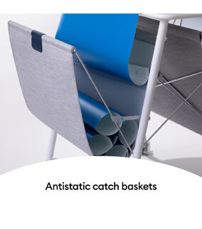 Securely dock your machine in place and keep your workspace looking sharp with this stunning Docking Stand for Cricut Venture. The easy-glide wheels with safety lock allow for expert maneuverability, or storage while not in use. Built-in material roll supports hold rolls of Smart Materials, and antistatic catch baskets keep your cuts from touching the floor. Plus, two storage hooks keep your machine mats out of the way while not in use. Requires Cricut Venture.