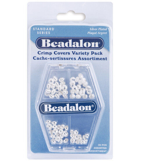 BEADALON-Crimp Covers Variety Pack. These Packages contain 80 pieces: 20 each of four styles. Finishes: Silver Plated and Gold Plated (each sold separately). Nickel-free plating. Covers are packaged in a reusable compact. Imported.