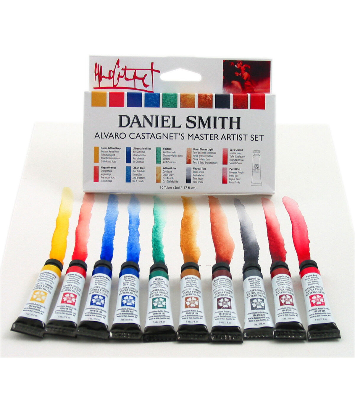 Creativity abounds with this unique collection. The 12-color 5ml set combines the basic primaries in the Essentials Set and the extra-fine, stunning mineral paints in the PrimaTek Set. Colors included in set are pthalo blue (GS), French ultramarine, pyrrole scarlet, quinacridone rose, new gamboge, hansa yellow light, hematite genuine, piemontite genuine, Mayan blue genuine, amethyst genuine, jadeite genuine and rhodonite genuine. The 10-Color Alvaro Castagnet's Master Artist Set includes hansa yellow deep, Mayan orange, ultramarine blue, cobalt blue, viridian, yellow ochre, burnt sienna light, neutral tint, deep scarlet and pyrrole red.