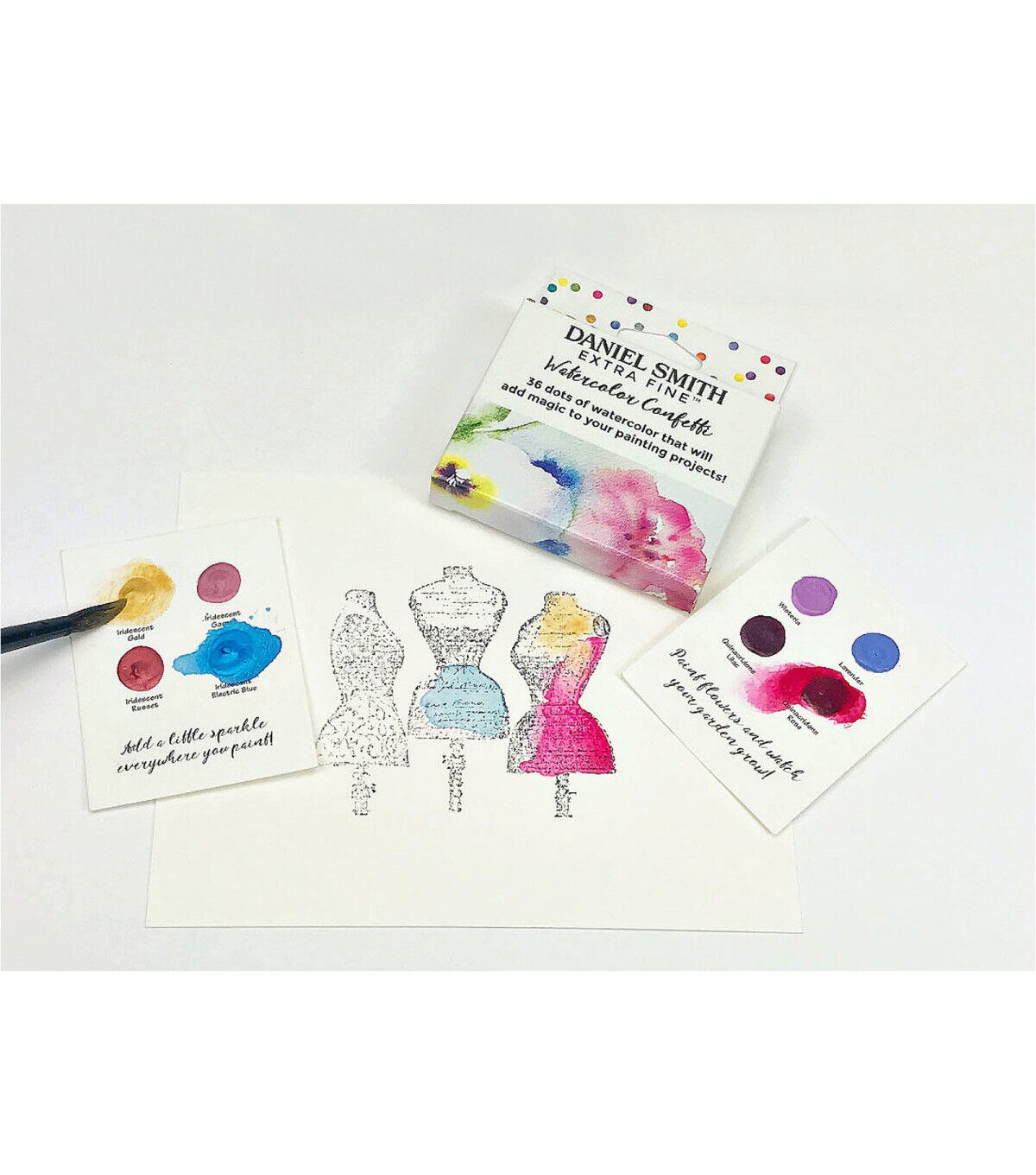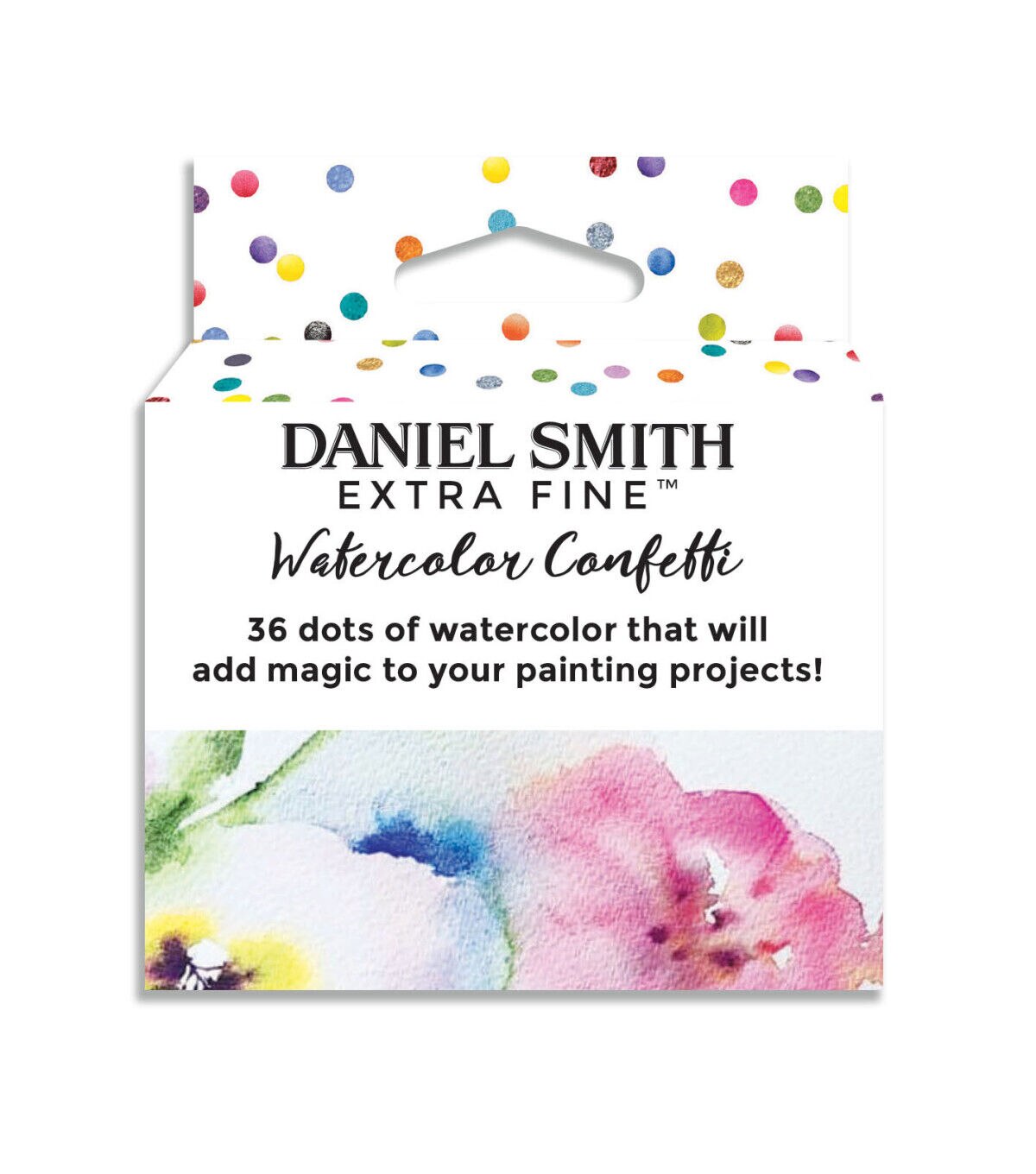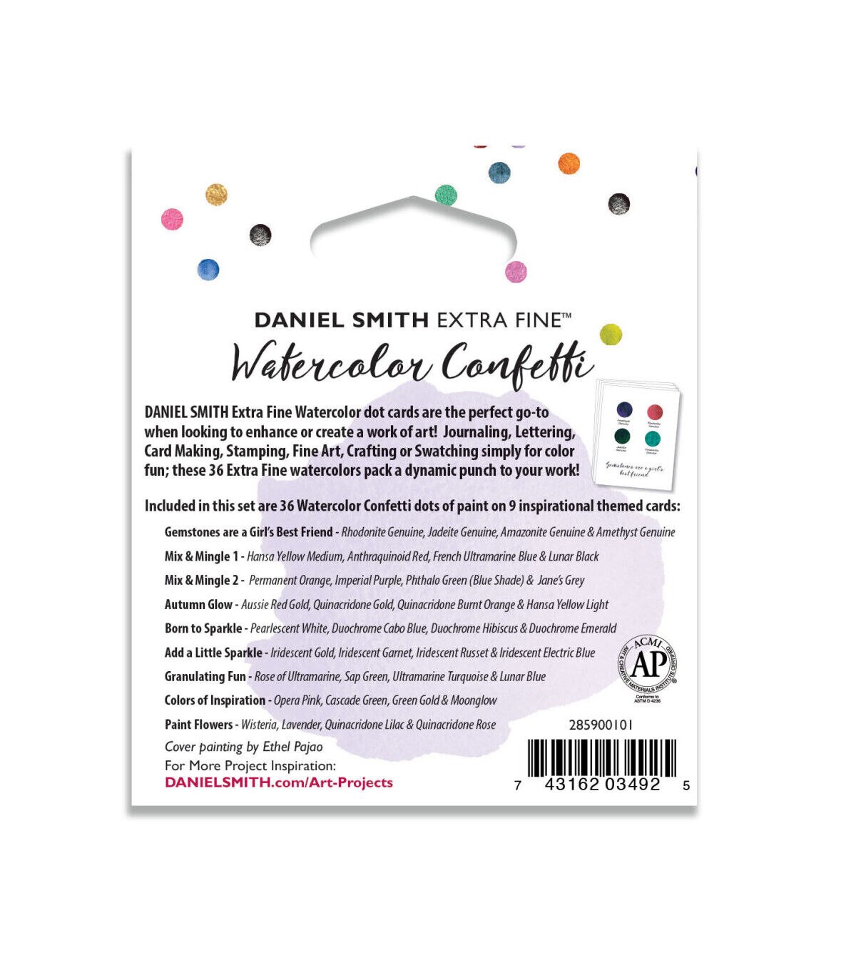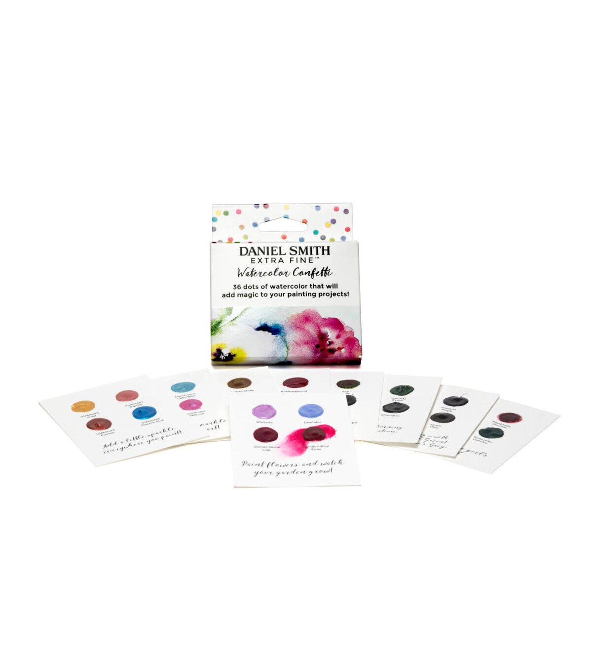 If you love taking a paint brush to a new color, painting out a stroke, watching the color flow across your paper and experiencing the joy of a beautiful new watercolor, the dot card is a must-have! Daniel Smith has created an easy way to try various colors from the Extra Fine Watercolor line. The Confetti 36-Color Dot Card Pack includes 36 dots of watercolor paint on nine inspirational themed cards: Gemstones - rhodonite genuine, jadeite genuine, amazonite genuine and amethyst genuine; Mix & Mingle 1 - hansa yellow medium, anthraquinoid red, French ultramarine blue and lunar black; Mix & Mingle 2 - permanent orange, imperial purple, pthalo green (blue shade) and Jane's gray; Autumn Glow - Aussie red gold, quinacridone gold, quinacridone burnt orange and hansa yellow light; Born to Sparkle - pearlescent white, duochrome Cabo blue, duochrome hibiscus and duochrome emerald; Add a Little Sparkle - iridescent gold, iridescent garnet, iridescent russet and iridescent electric blue; Granulating Fun - rose of ultramarine, sap green, ultramarine turquoise and lunar blue; Colors of Inspiration - opera pink, cascade green, green gold and moonglow; Paint Flowers - wisteria, lavender, quinacridone lilac and quinacridone rose.