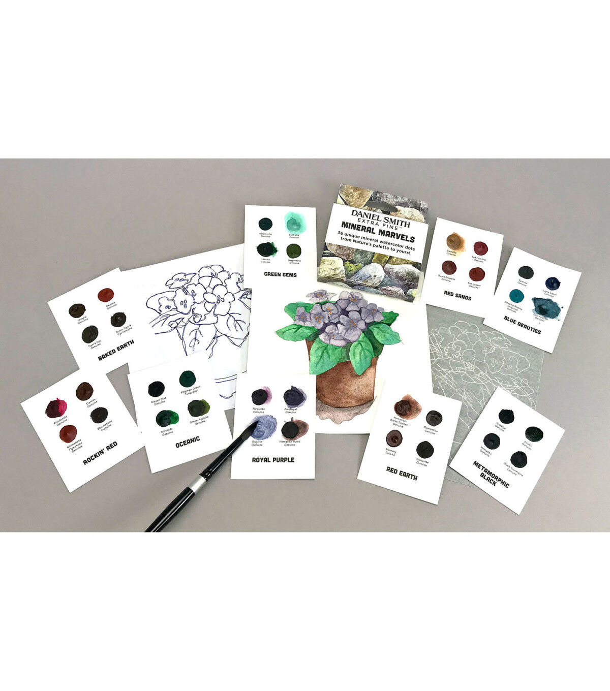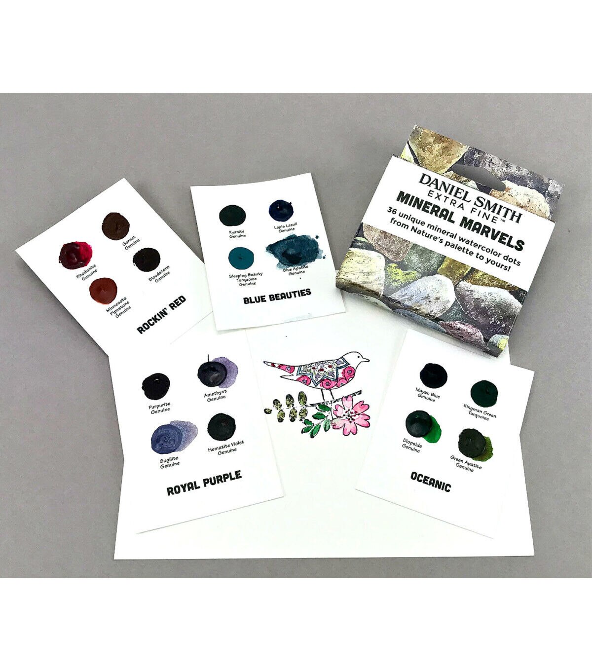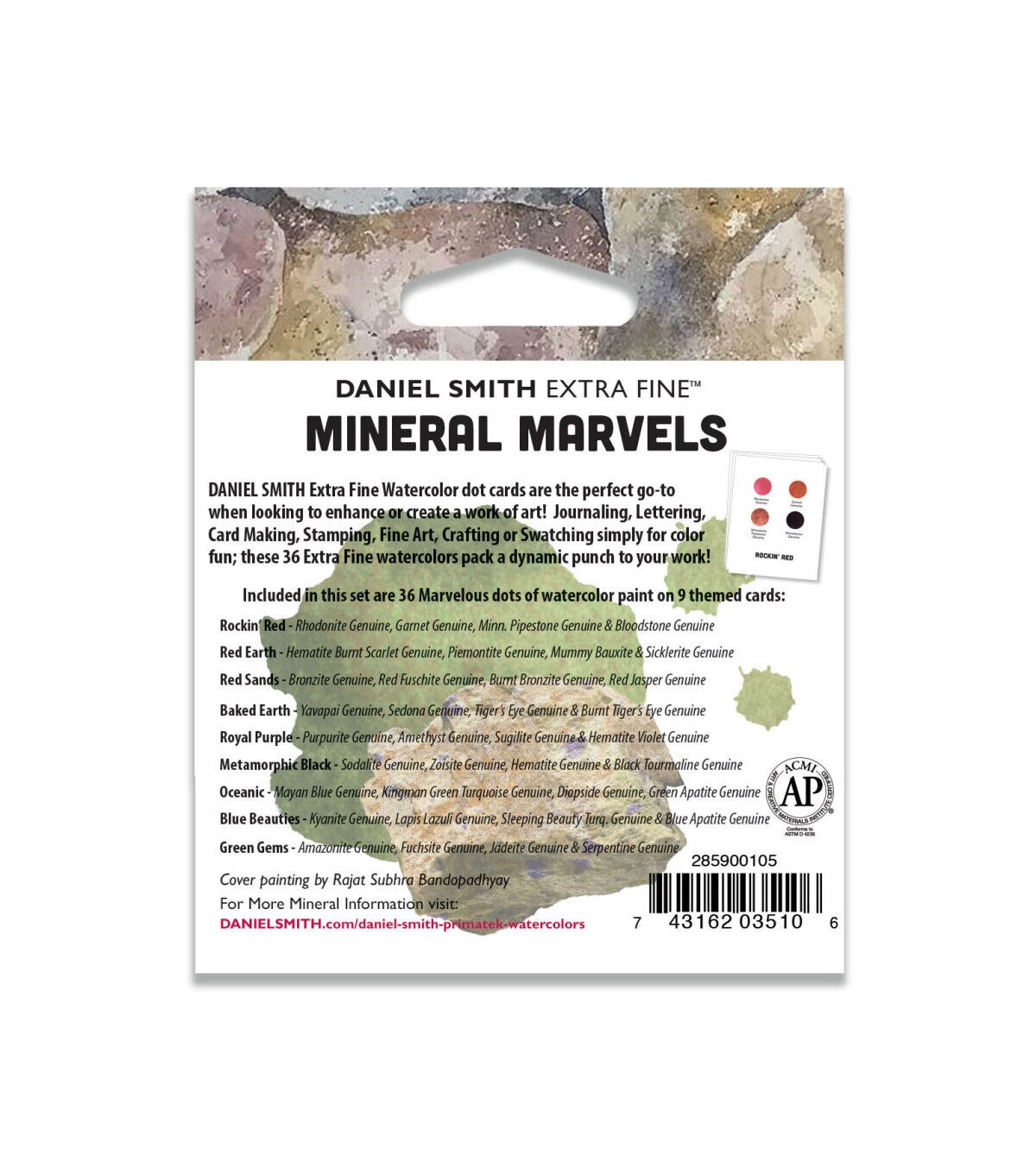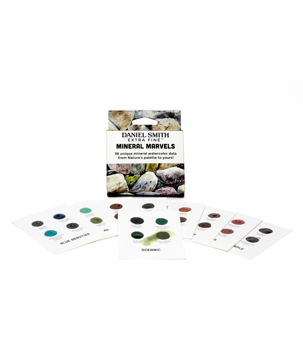 If you love taking a paint brush to a new color, painting out a stroke, watching the color flow across your paper and experiencing the joy of a beautiful new watercolor, the dot card is a must-have! Daniel Smith has created an easy way to try various colors from the Extra Fine Watercolor line. The Confetti 36-Color Dot Card Pack includes 36 dots of watercolor paint on nine inspirational themed cards: Gemstones - rhodonite genuine, jadeite genuine, amazonite genuine and amethyst genuine; Mix & Mingle 1 - hansa yellow medium, anthraquinoid red, French ultramarine blue and lunar black; Mix & Mingle 2 - permanent orange, imperial purple, pthalo green (blue shade) and Jane's gray; Autumn Glow - Aussie red gold, quinacridone gold, quinacridone burnt orange and hansa yellow light; Born to Sparkle - pearlescent white, duochrome Cabo blue, duochrome hibiscus and duochrome emerald; Add a Little Sparkle - iridescent gold, iridescent garnet, iridescent russet and iridescent electric blue; Granulating Fun - rose of ultramarine, sap green, ultramarine turquoise and lunar blue; Colors of Inspiration - opera pink, cascade green, green gold and moonglow; Paint Flowers - wisteria, lavender, quinacridone lilac and quinacridone rose.