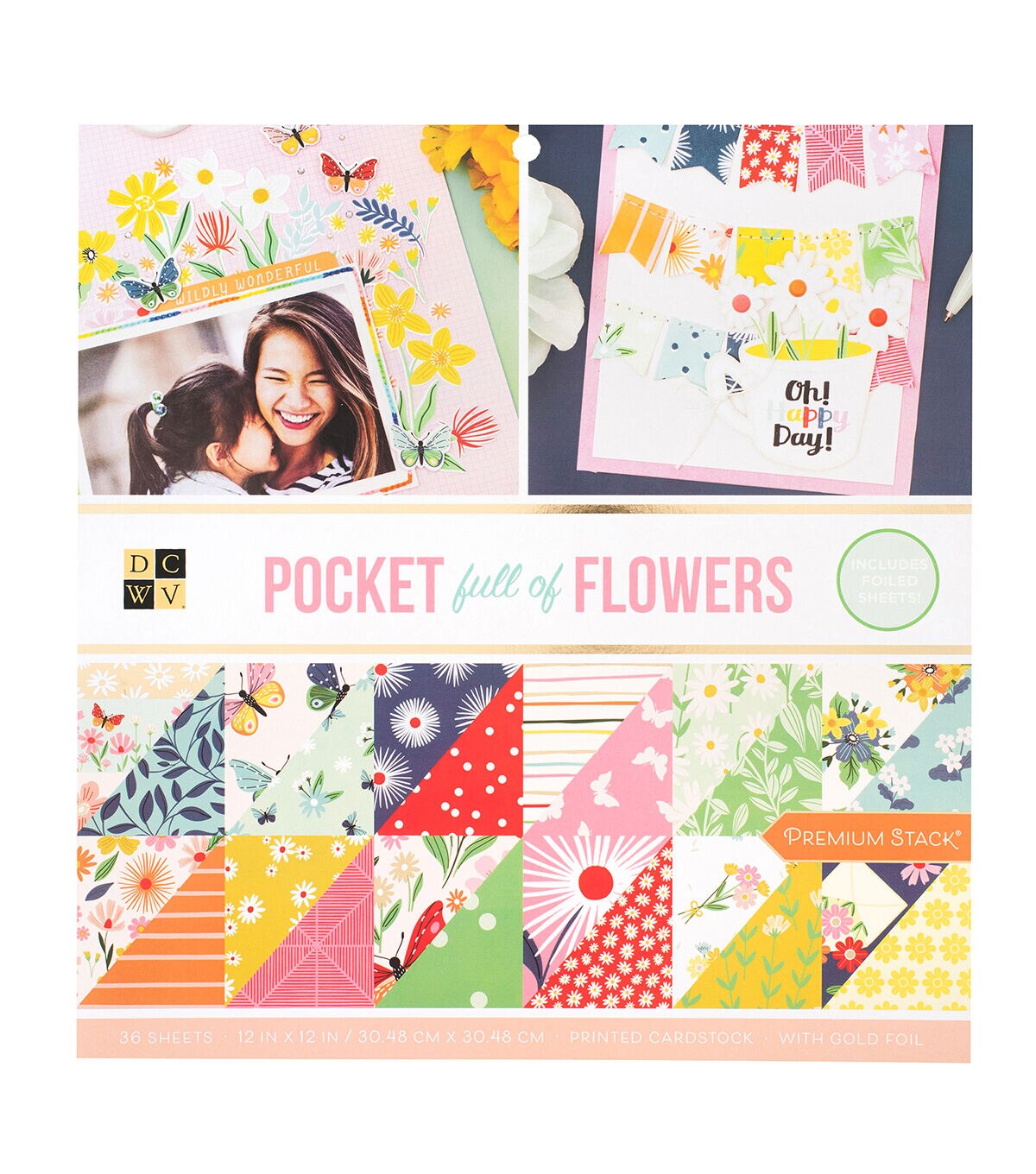 DCWV Stacks have something for everyone and every style! Stacks come in a variety of color combinations and designs to fit the look of your projects. The Pocket Full of Flowers stack features a rainbow color palette that complements floral patterns. This stack includes 36 sheets of 12x12-inch paper, double-sided, with gold foil accents.