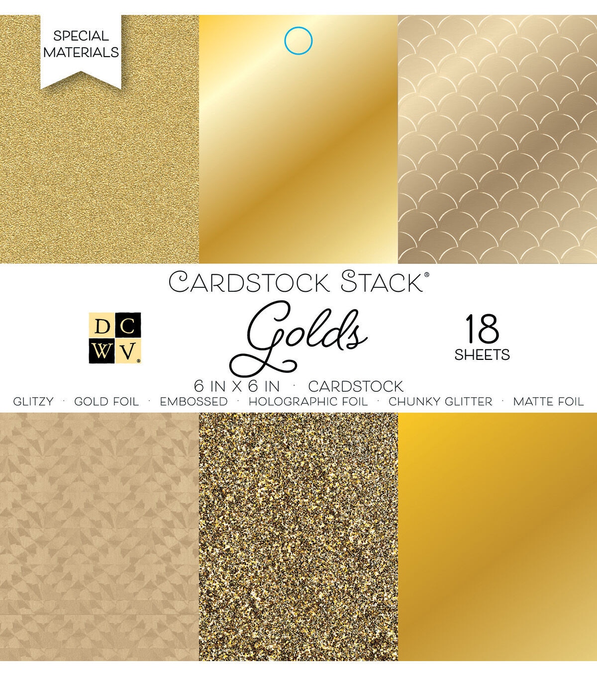 The DCWV 6” x 6” Cardstock Stack-Golds is perfect for your cards, tags, scrapbook page embellishments, journaling additions, and more. The cardstock stack includes three sheets with each of the following treatments: glitzy glitter, gold foil, embossed designs, holographic foil, chunky glitter, and matte foil. You can use these sheets to make to all-occasion cards, tags, mixed media projects, invitations, and more.