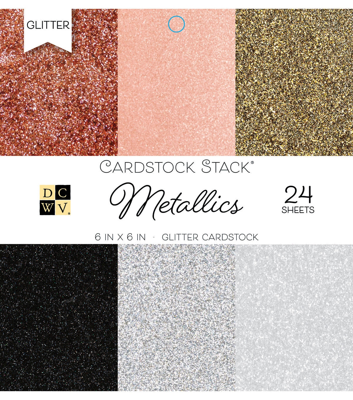 The DCWV 6” x 6” Glitter Cardstock Stack-Metallics offers the perfect assortment for your cards, tags, scrapbook page embellishments, journaling additions, and more. You can use them as-is, in your die-cut machines, with your favorite Fiskars punches, and more to create just what you need. This cardstock stack contains twenty-four, 6” x 6” glitter cardstock sheets, including four sets of each color, which can be used with scissors, paper punches and more.