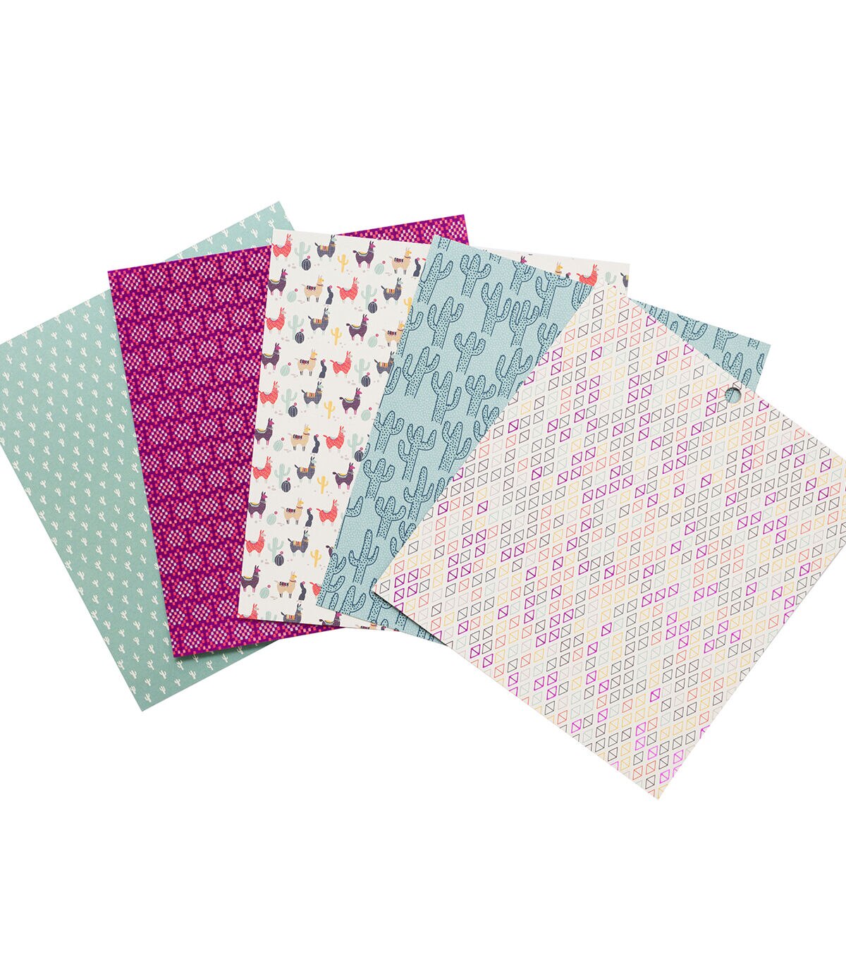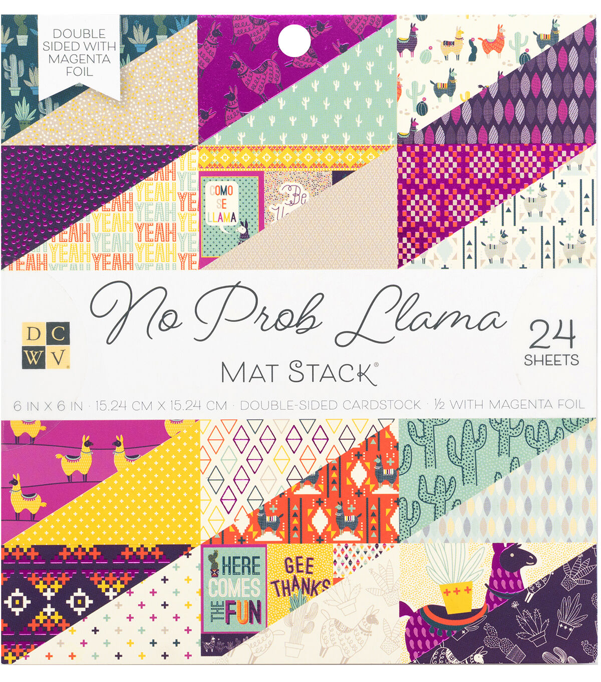 Explore your creativity with the DCWV 6” x 6” Cardstock Stack-No Prob Llama. This 6 x 6-inch mat stack includes 24 printed cardstock sheets with foil accents. They’re great for accenting cards, tags, scrapbook pages, invites, party decor, and lots more. You can use them as-is, in your die-cut machines, with your favorite Fiskars punches, and in a variety of other ways to create just what you need.