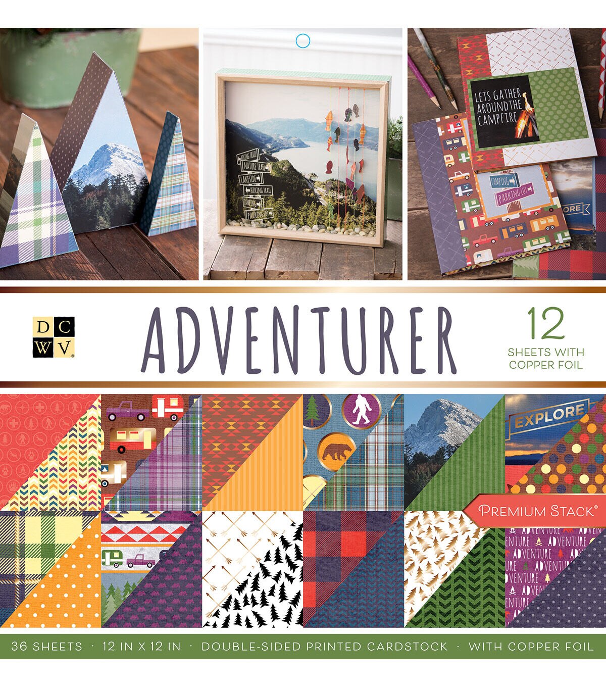 The pages in the DCWV 12"x12" Premium Printed Cardstock Stack-Adventurer are great for a travel journal, planner dashboard, set of cards or tags, or a shadow box display. You can also use them for home decor projects that remind you of your favorite trip. This pack of 36 double-sided cardstock sheets will help you find an excuse for an adventure soon. Some of the pages have copper foil accents for added appeal.