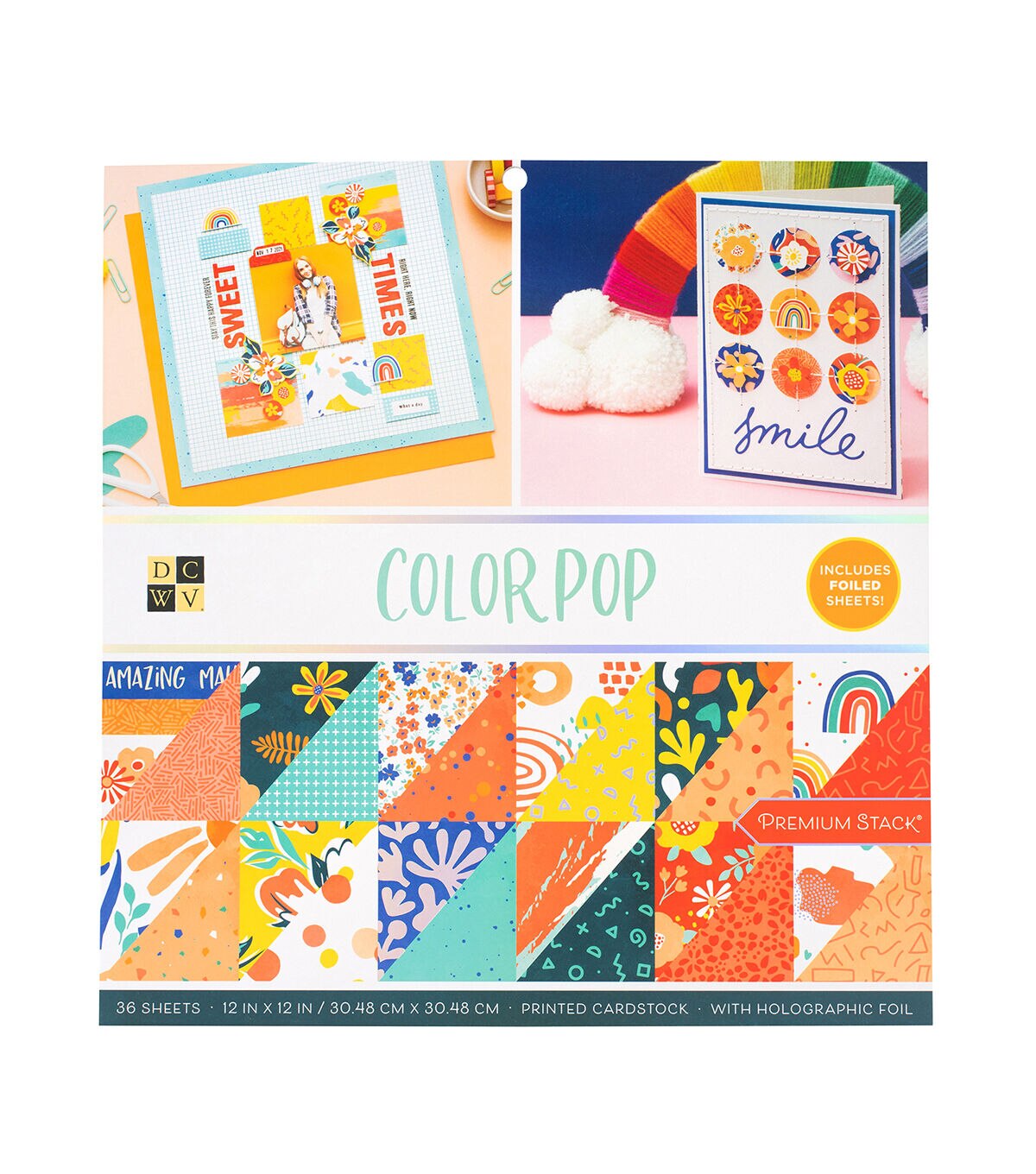 DCWV Stacks have something for everyone and every style! Stacks come in a variety of color combos and designs to fit the look of your projects. The Color Pop stack features a rainbow of beautiful colors that complement fun, bold patterns. This stack includes 36 sheets of 12x12-inch paper, double-sided, with holographic foil accents.