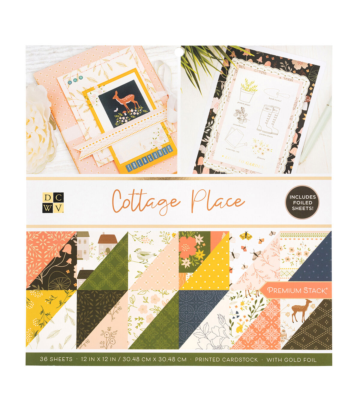 DCWV Stacks have something for everyone and every style! Stacks come in a variety of color combinations and designs to fit the look of your projects. The Cottage Place stack features a deep rainbow palette that complement floral patterns. This stack includes 36 sheets of 12x12-inch paper, double-sided, with gold foil accents.