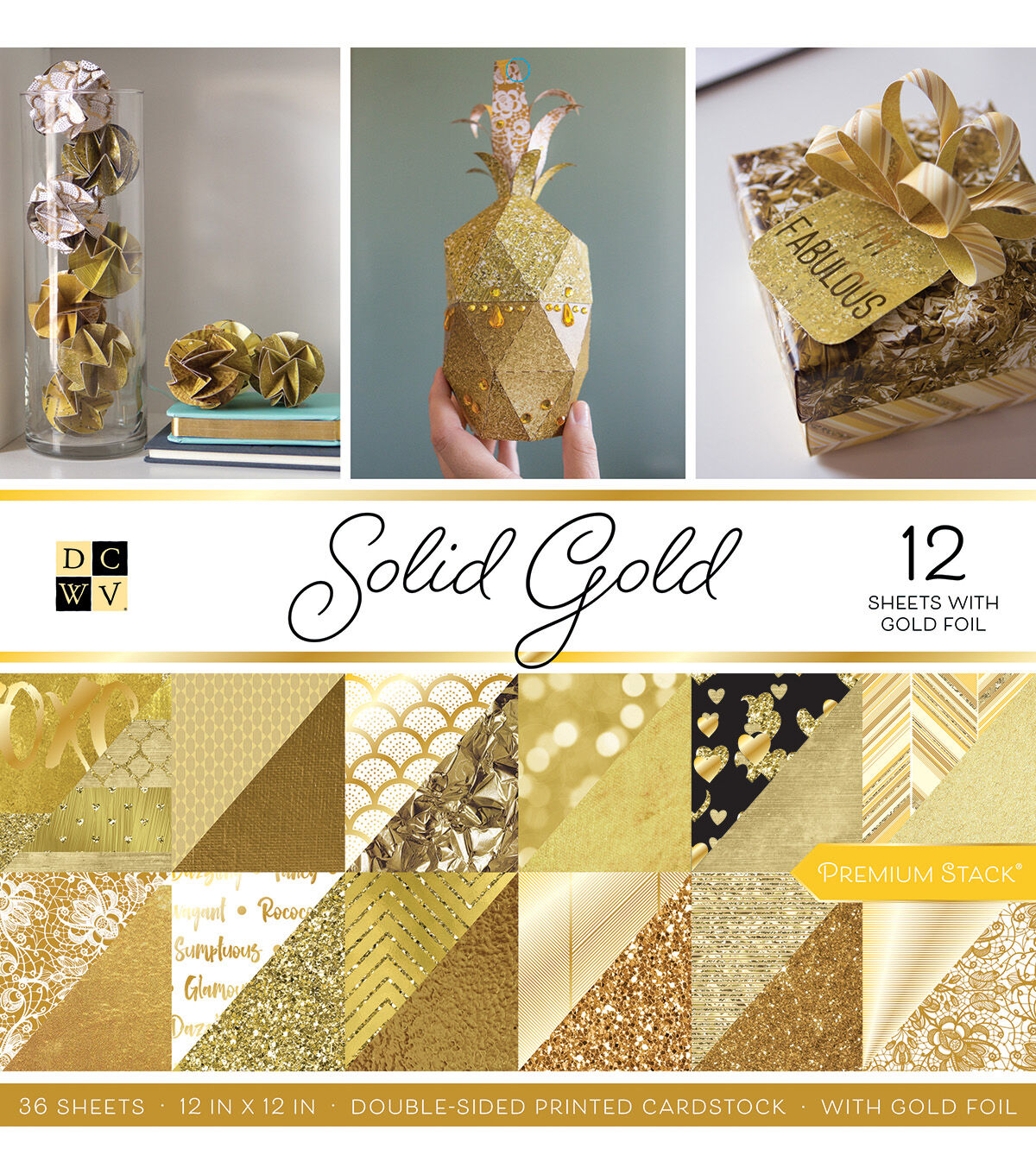 Glam up your projects, with the DCWV 12" x 12" Premium Printed Cardstock Stack-Solid Gold. Use these eye-catching, gold-hued prints, to add style to cards, scrapbooks and more. The pack contains thirty-six, 12 x 12-inch double-sided, printed cardstock pages, which work well with scissors, paper punches, scoring and distressing tools.