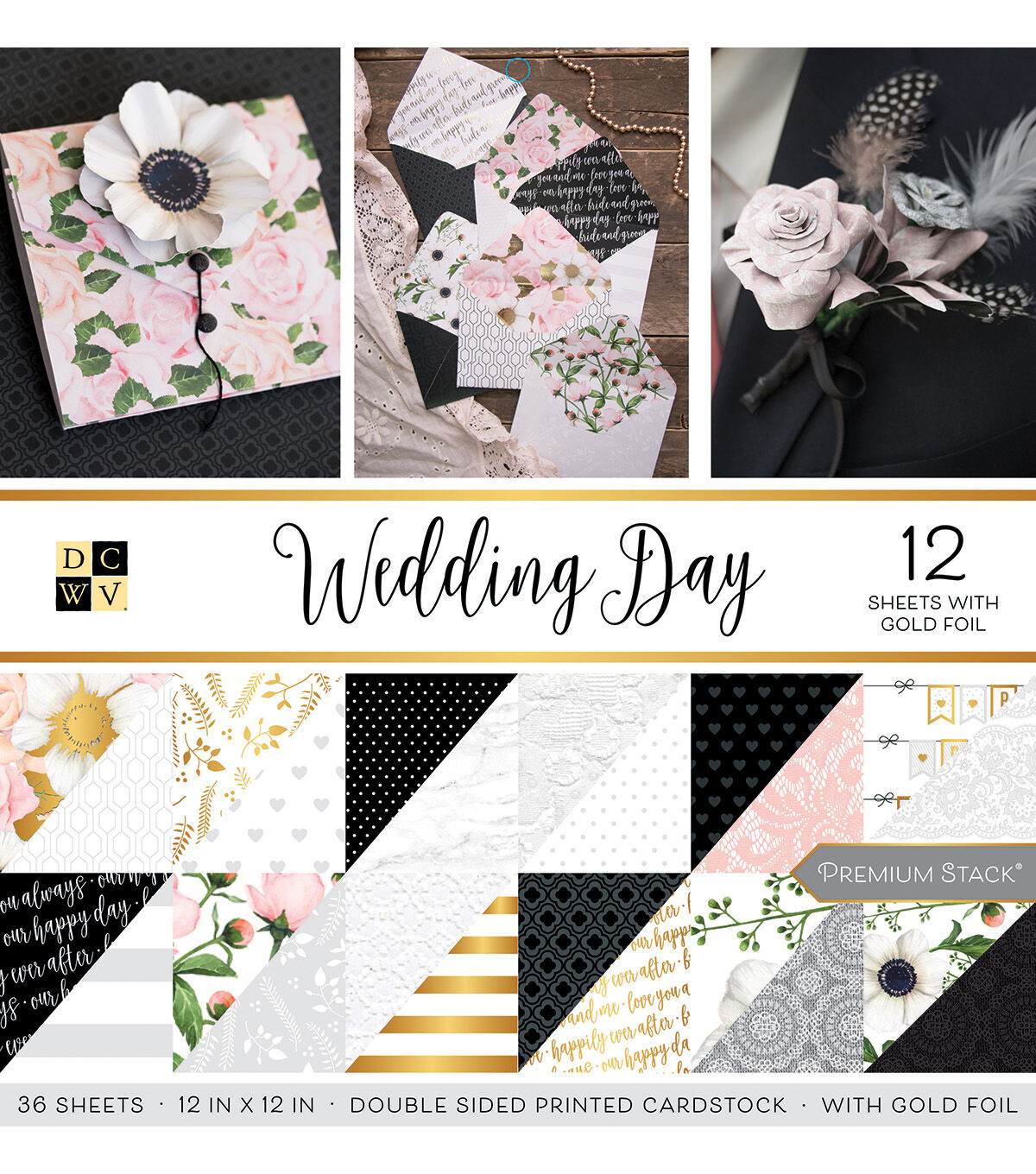 Personalize your wedding decor, giveaways and more, with the DCWV 12" x 12" Premium Stack Printed Cardstock-Wedding Day. These papers showcase hearts and dots, flowers and strips, words, and geometric prints. You can use them to make photo booth banners, place cards, napkin wraps, corsages, paper flowers and take-away boxes. They’re also great for tags, cards and envelopes. Some of the papers have gold foil accents for an eye-catching look. The pack includes 36 double-sided printed cardstock sheets.