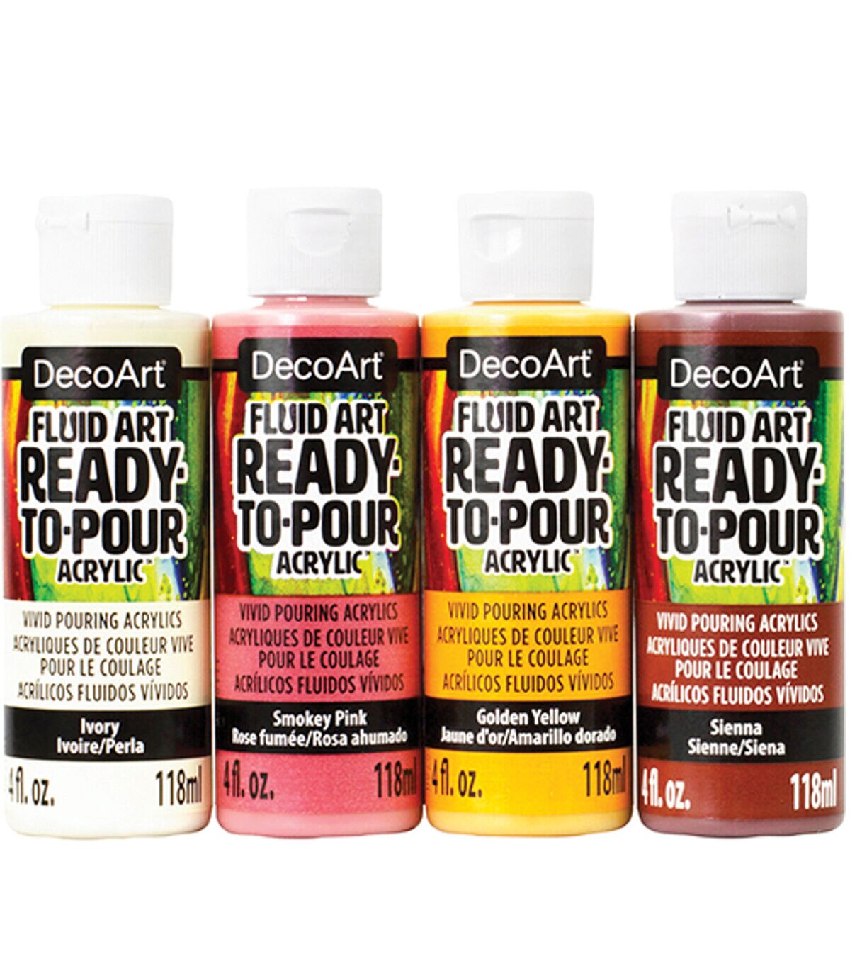 DecoArt Fluid Art Acrylic Packs make paint pouring easy, convenient, and affordable. Each set contains four 4-oz. bottles of carefully curated coordinating paints.