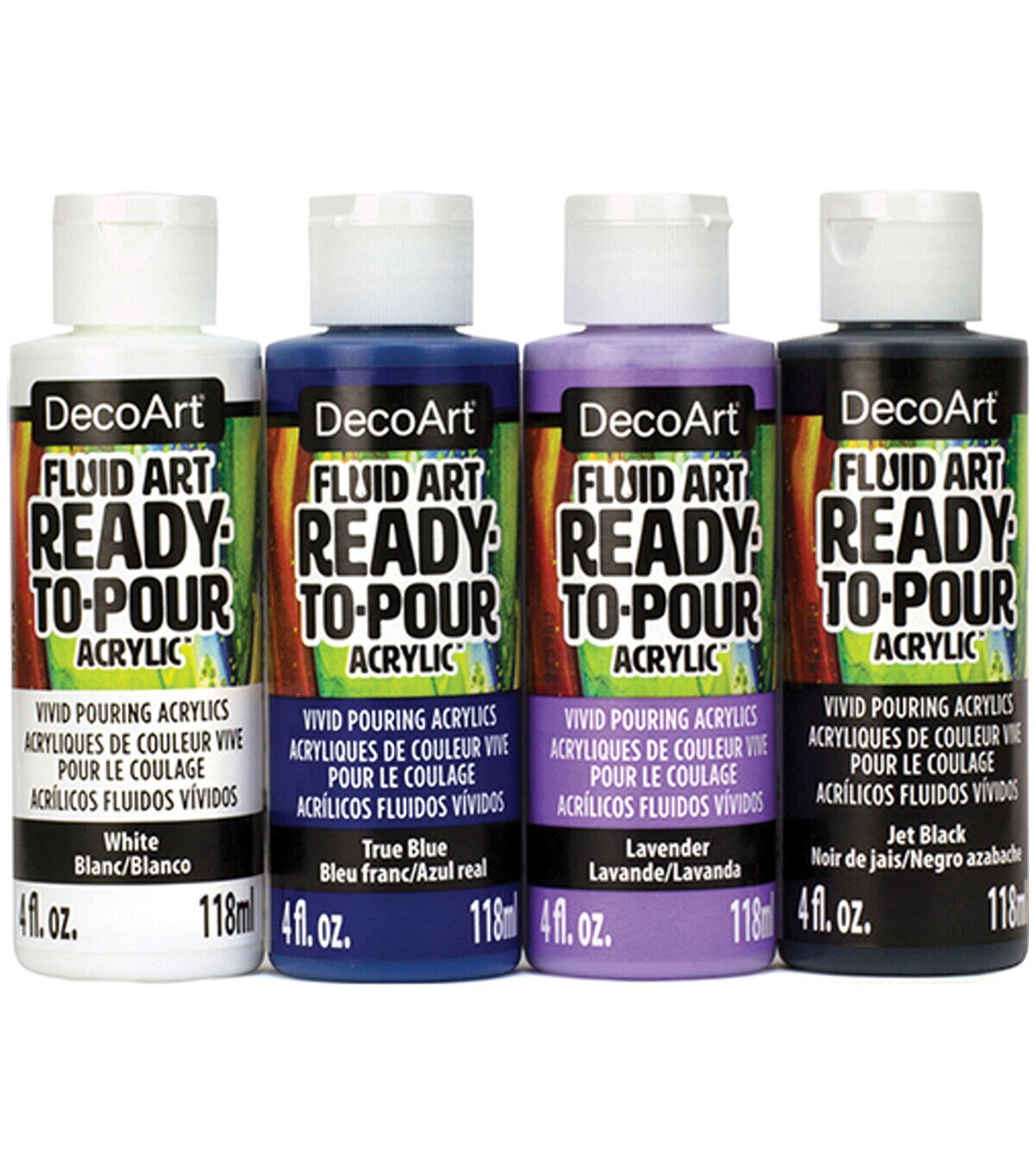 Paint pouring has never been easier than using these ready-to-pour acrylics. Each Value Pack contains (4) 4 oz. bottles of pre-selected coordinating color combinations for vibrant, stunning results every time. The Galactic value pack contains (1) 4 oz. bottle of each of the following colors: White, True Blue,Lavender, and Jet Black.