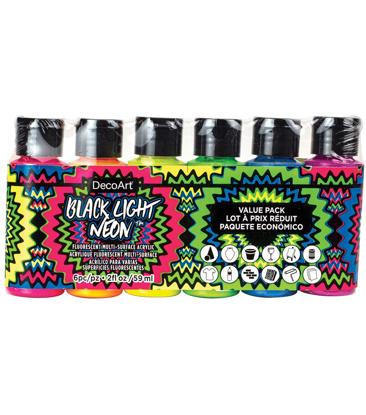 Electrify wearables, art and craft projects, and home décor with this intense neon paint. Utilizing fluorescent pigment technology, these psychedelic art and craft paints can be used on many surfaces and create vivd glow in the dark effects when viewed under a black light.