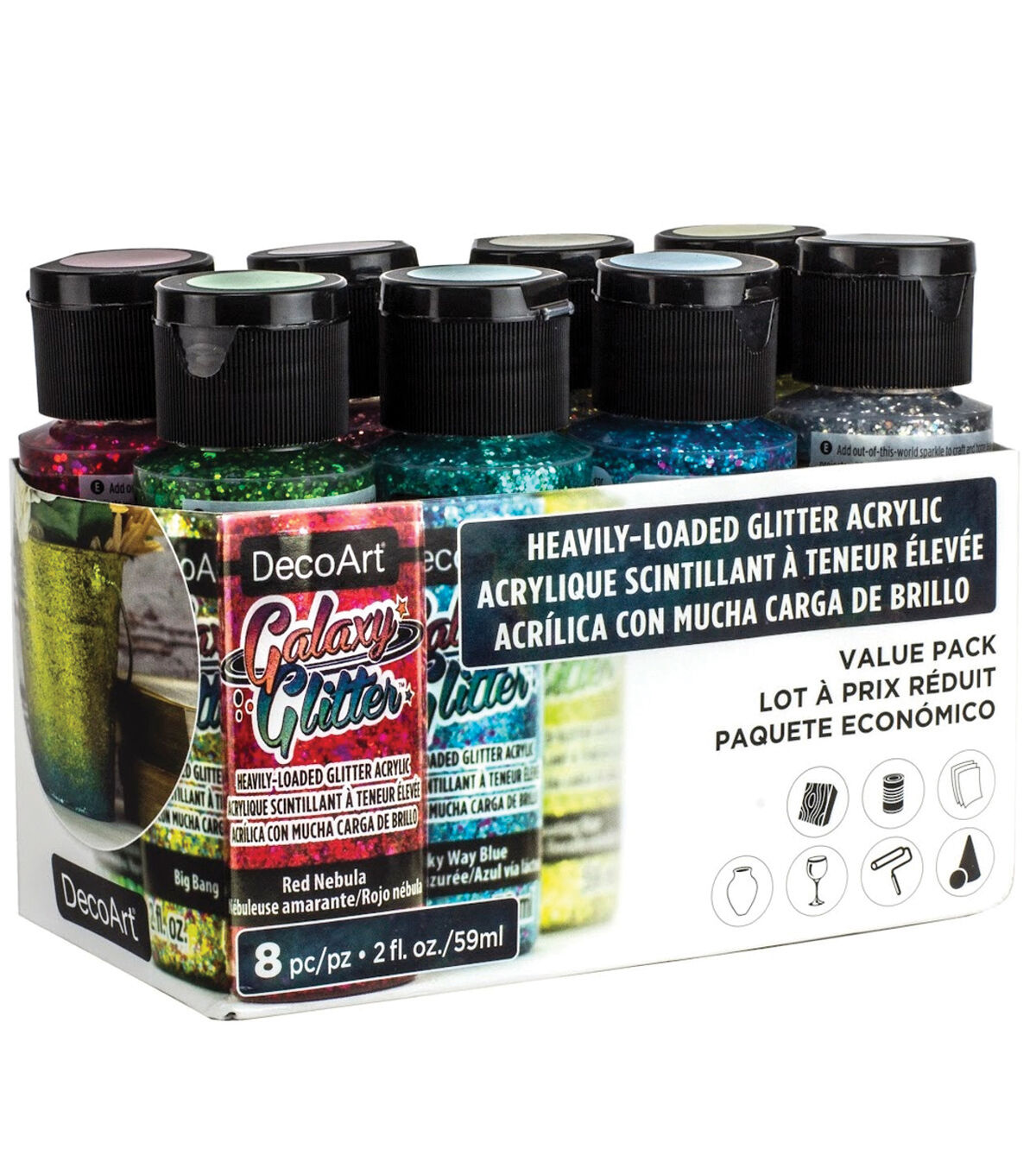 Create OUT of this world glitter projects with DecoArt's Galaxy Glitter 8-Color set. Galaxy Glitter is our biggest boldest glitter flakes ever. A brush-on glitter acrylic that is easy to use for a big wow.