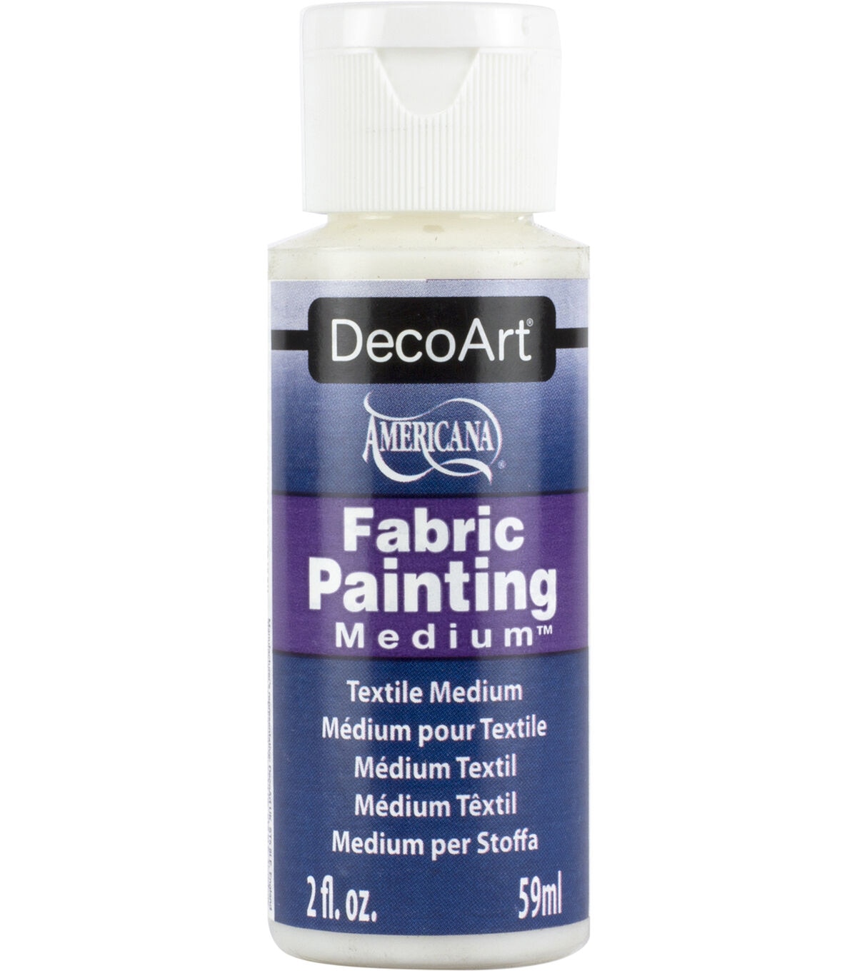Create washable, permanent fabric paint by mixing this medium with any acrylic paint. Improves the bond to the fabric and helps prevent cracking, peeling and fading. Will not dilute acrylic color. Suitable for clothing and home decor fabrics. For best results, pre-wash fabric without fabric softener. Mix 2 parts paint to 1 part medium. Apply to fabric with brush or sponge and allow to dry 24-48 hours. Then heat-set for 30 seconds with an iron. Wash inside-out on gentle cycle. Water-based. AP Seal, non-toxic. 2 oz. bottle.