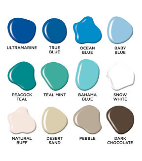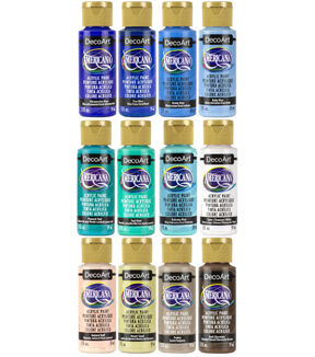 - What's included: 12 bottles of Americana Acrylic paint - Ultramarine Blue, Bahama Blue, Ocean Blue, Pebble, Natural Buff, Peacock Teal, Teal Mint, Snow White, True Blue, Baby Blue, Chocolate, and Desert Sand. All bottles are 2 fluid ounces each