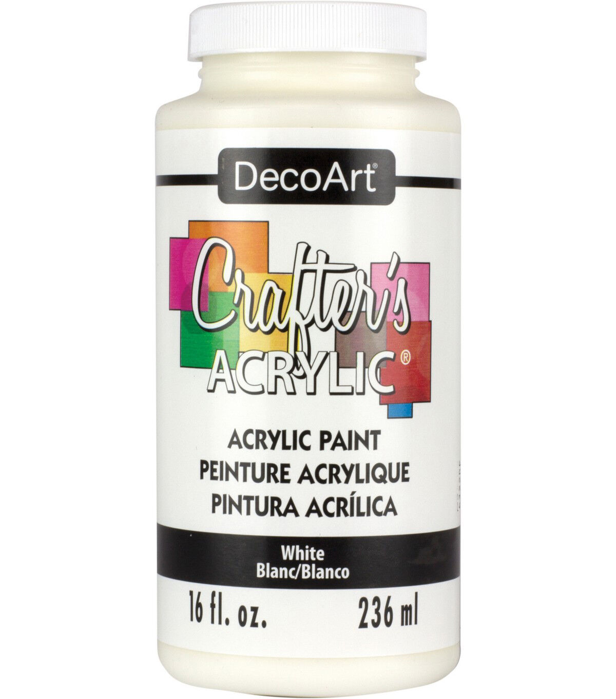 Perfect for painting craft projects and home decor! This 2.8x2.8x6.2 inch package contains 16 fl oz of white crafter's acrylic paint. Conforms to ASTM D4236. Made in USA.