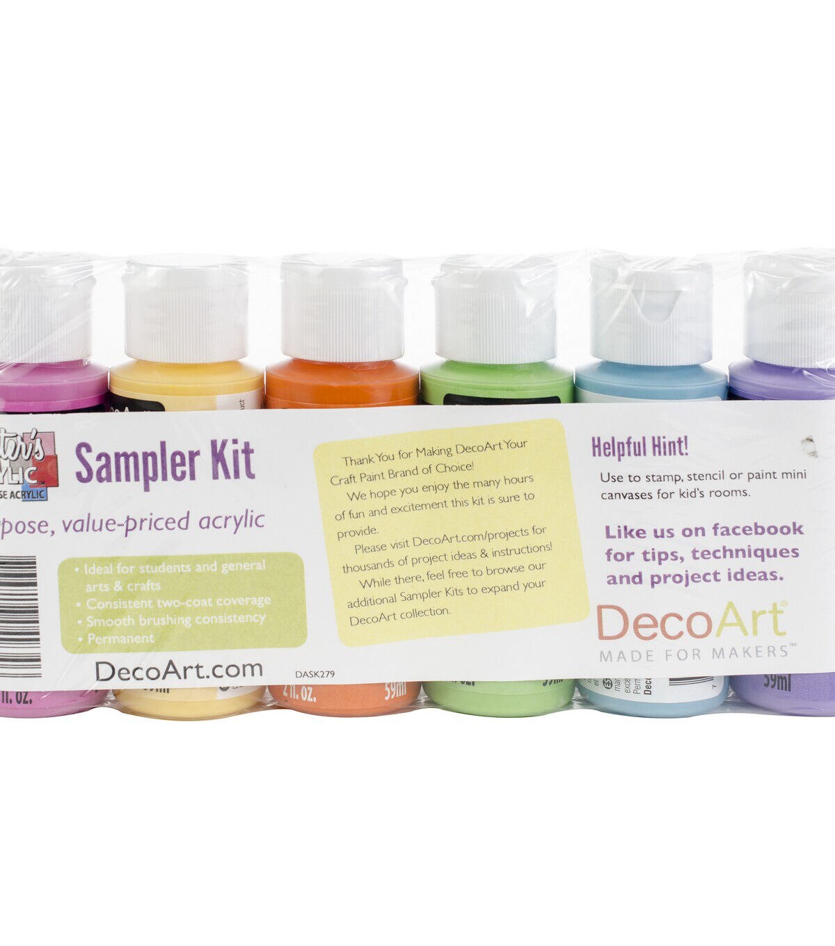 Versatile and easy to use, the DecoArt Crafter's Acrylic Sampler Kit-Brights can be used for your general arts and crafts, stenciling, ceramics, school projects and home decoration. This pack contains six 2-ounce tubes of acrylic paint in assorted colors. This kit also makes a great gift for an art enthusiast in your life.