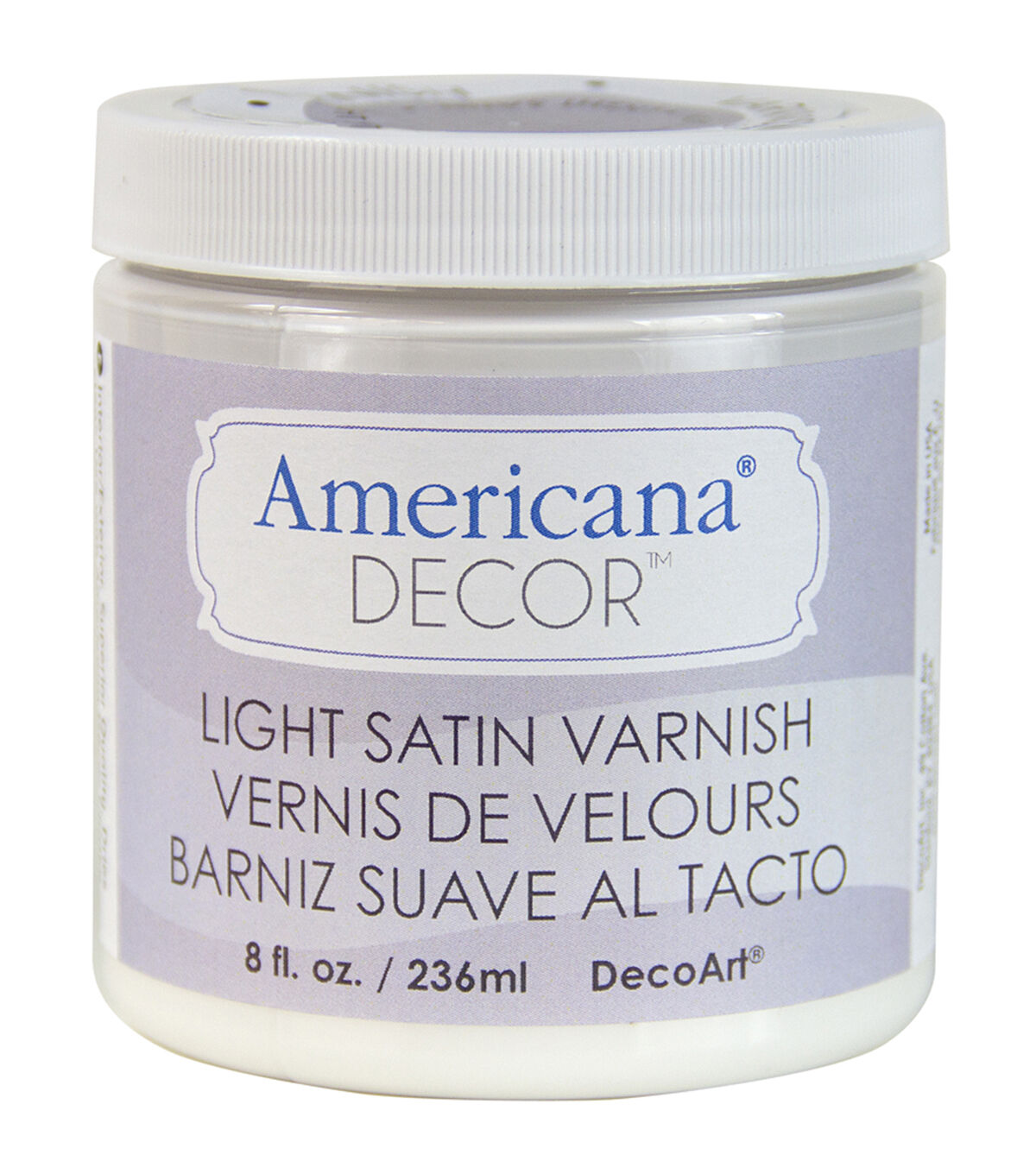 DECO ART-Varnish: Light Satin. Use with Americana Decor Chalky Finish Paint (sold separately) to deliver a durable; polyurethane finish with a light satin sheen. May also be used as a topcoat over any acrylic paint. This package contains one 8oz jar of light satin varnish. Conforms to ASTM D 4236. Made in USA.