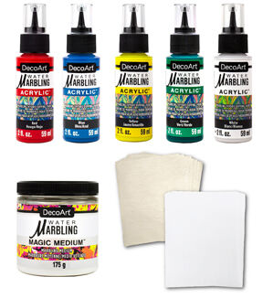 - What's included: 1 bottle of Magic Medium (8oz), 1 Pack of Premium Water Marbling Papers (20pc), 1 Pack of Premium Water Marbling Cleaning Papers (32pc), 5 bottles of Water Marbling Acrylic Paint - blue, green, red, yellow, white. All Water Marbling Acrylic Paints are 2 fluid ounces each.