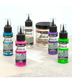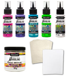 - What's included: 1 bottle of Magic Medium (8oz), 1 Pack of Premium Water Marbling Papers (20pc), 1 Pack of Premium Water Marbling Cleaning Papers (32pc), 5 bottles of Water Marbling Acrylic Paint - yellow-green, pink, white, tropical, blue, lavender)