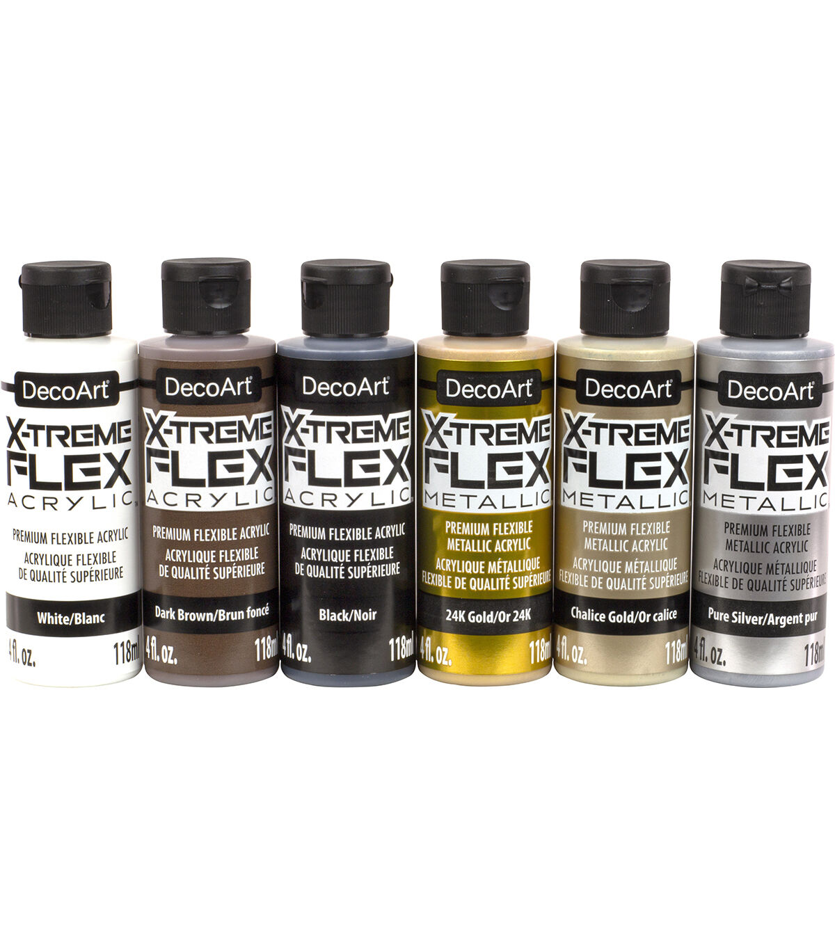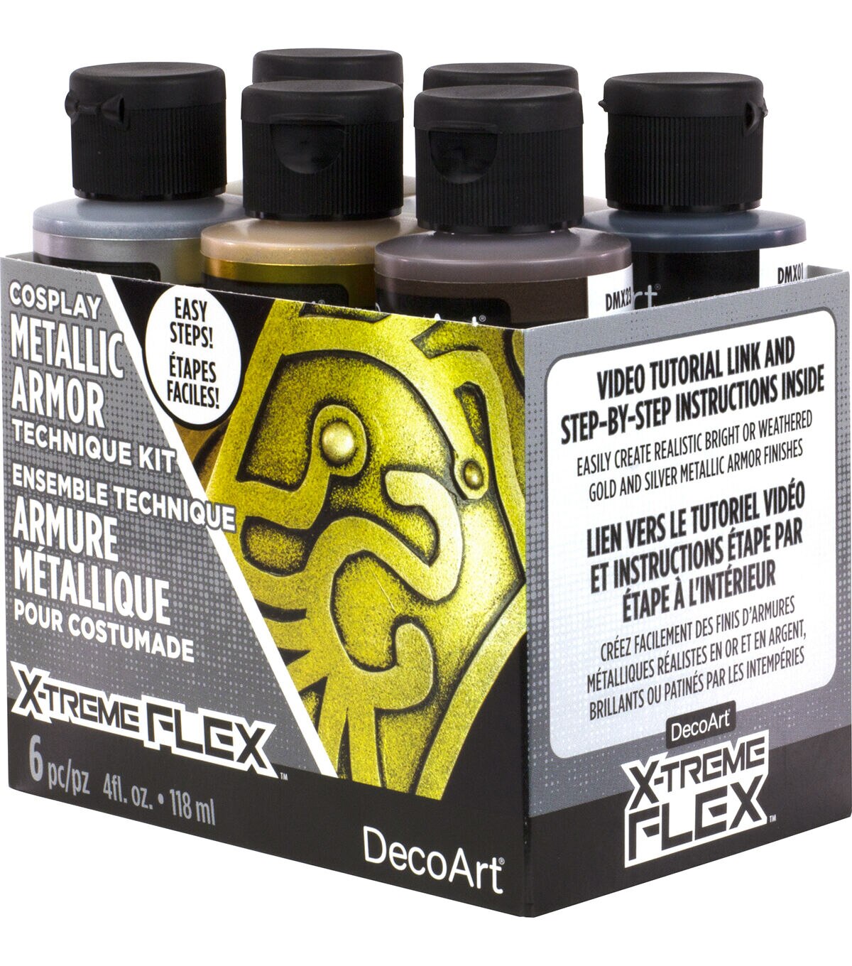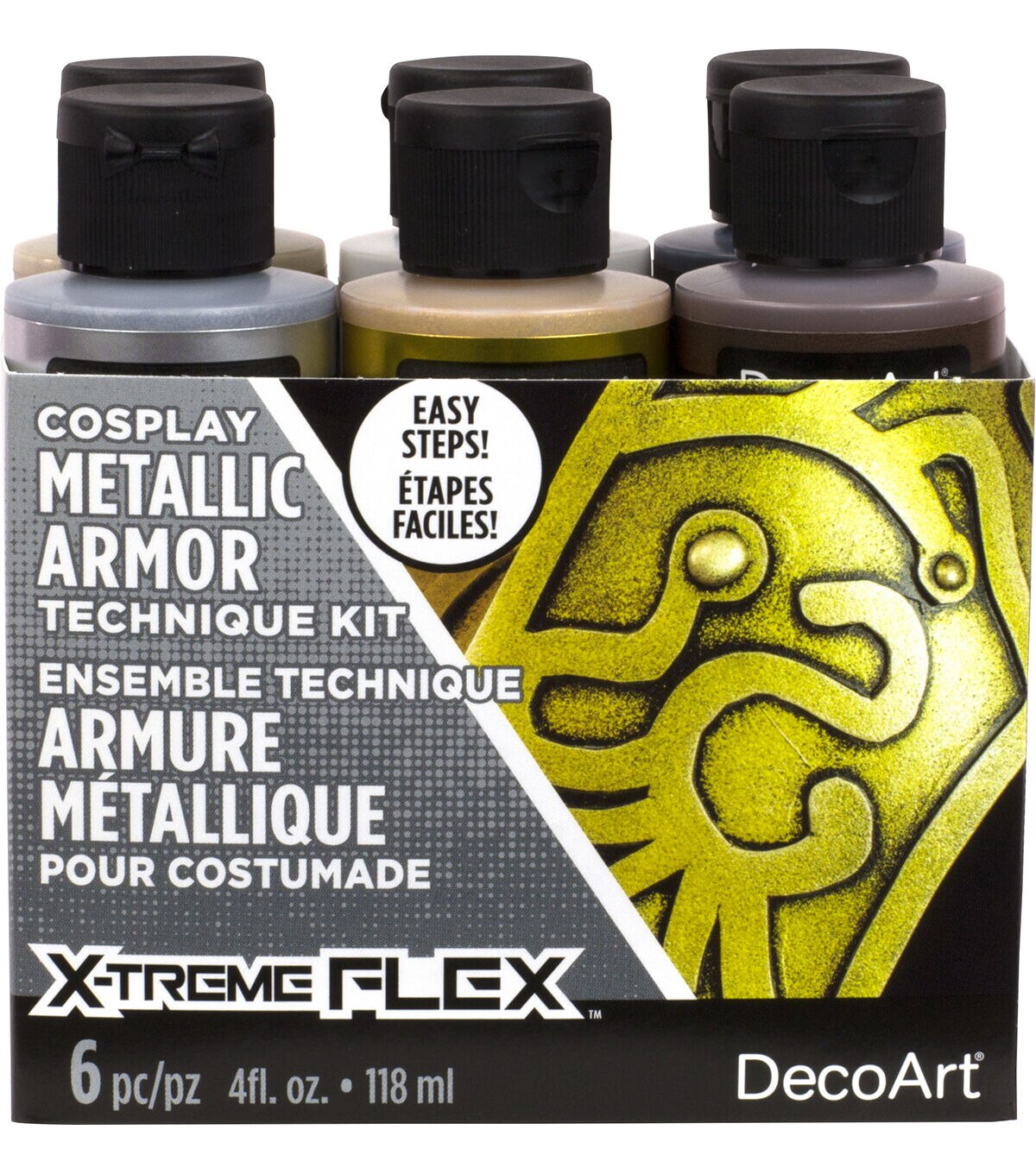 DecoArt Cosplay X-treme Flex Paint Kit Easily transform projects into realistic-looking metals and battle worn armor. The kit includes six 4 oz. jars of X-treme Flex Metallic and Acrylics. Metallic colors Chalice Gold, 24K Gold, Pure Silver. Acrylics colors Black, Dark Brown and white.